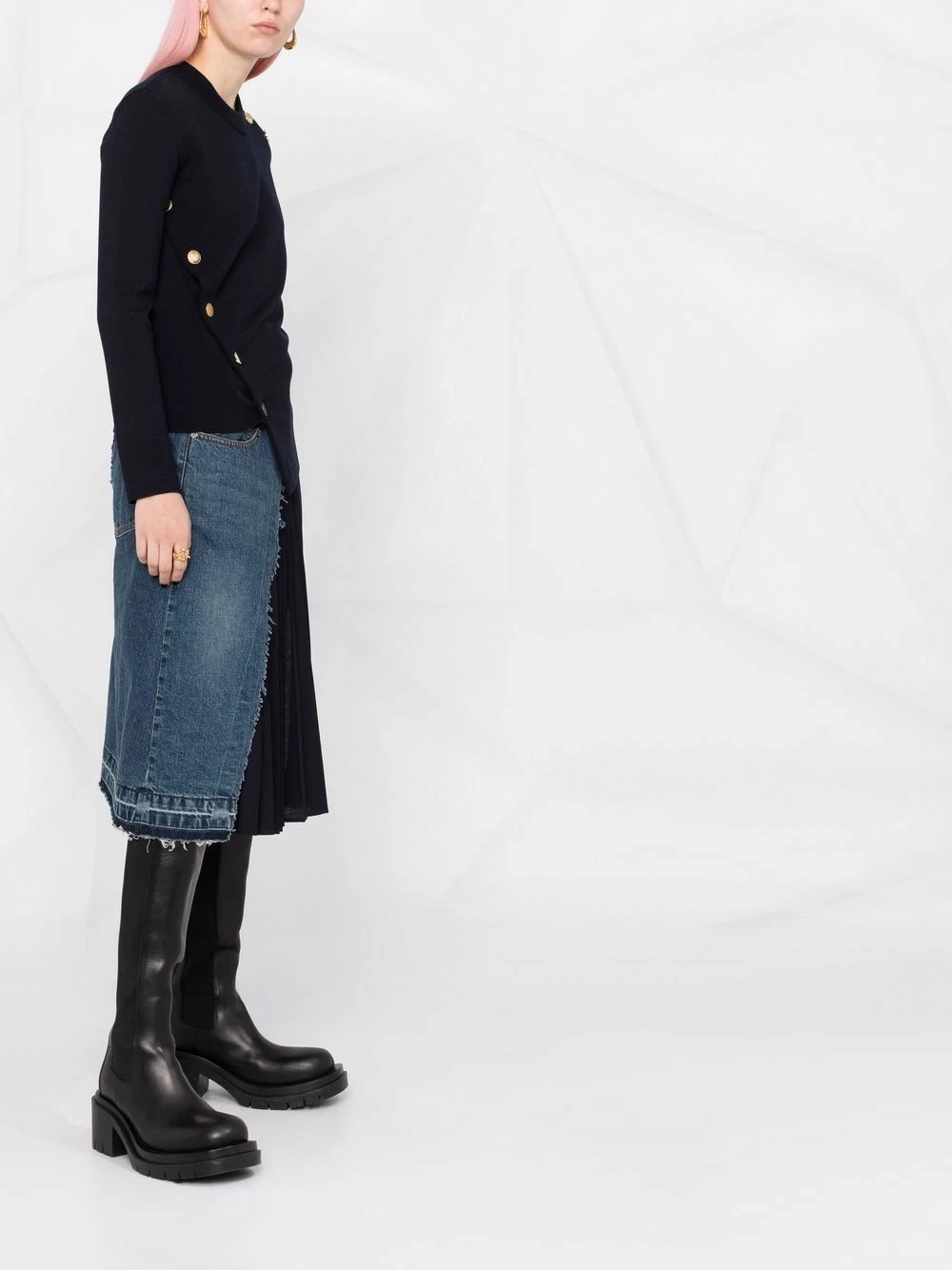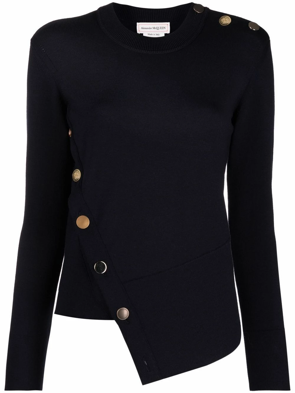 Alexander McQueen reworks the humble knitted top with unexpected details. This crew-neck iteration is accented with an asymmetric hem and gold-tone buttons that are highlighted against the navy background.