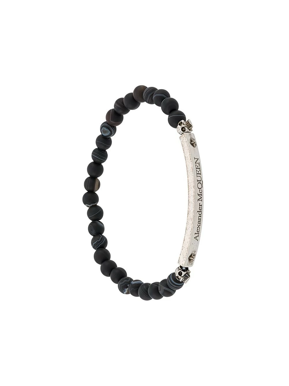 Home to the edgy and mysteriously alluring, Alexander McQueen is an encounter of finesse and duskiness. This black silver agate beaded bracelet from Alexander McQueen features silver plating, an engraved logo and a bead chain.