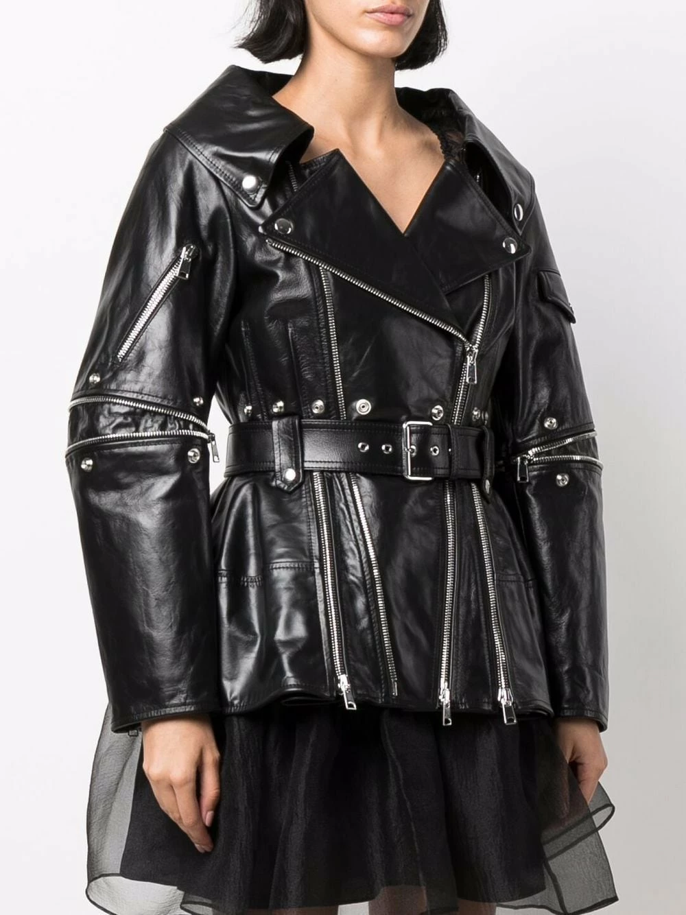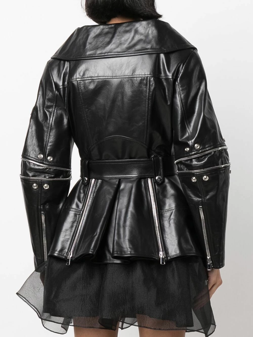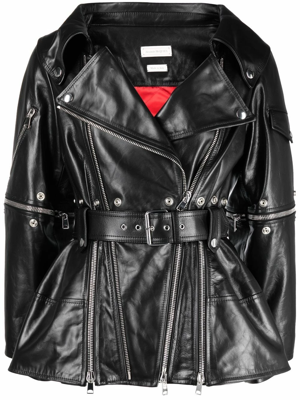 Alexander McQueen’s distinctly gothic design style is showcased in an innovative way on this leather jacket design. Creating a new take on a biker jacket silhouette with multiple panels and a high belted waist, it is punctuated with classic snap-button fastenings and zip details in edgy silver-tone hardware.Â