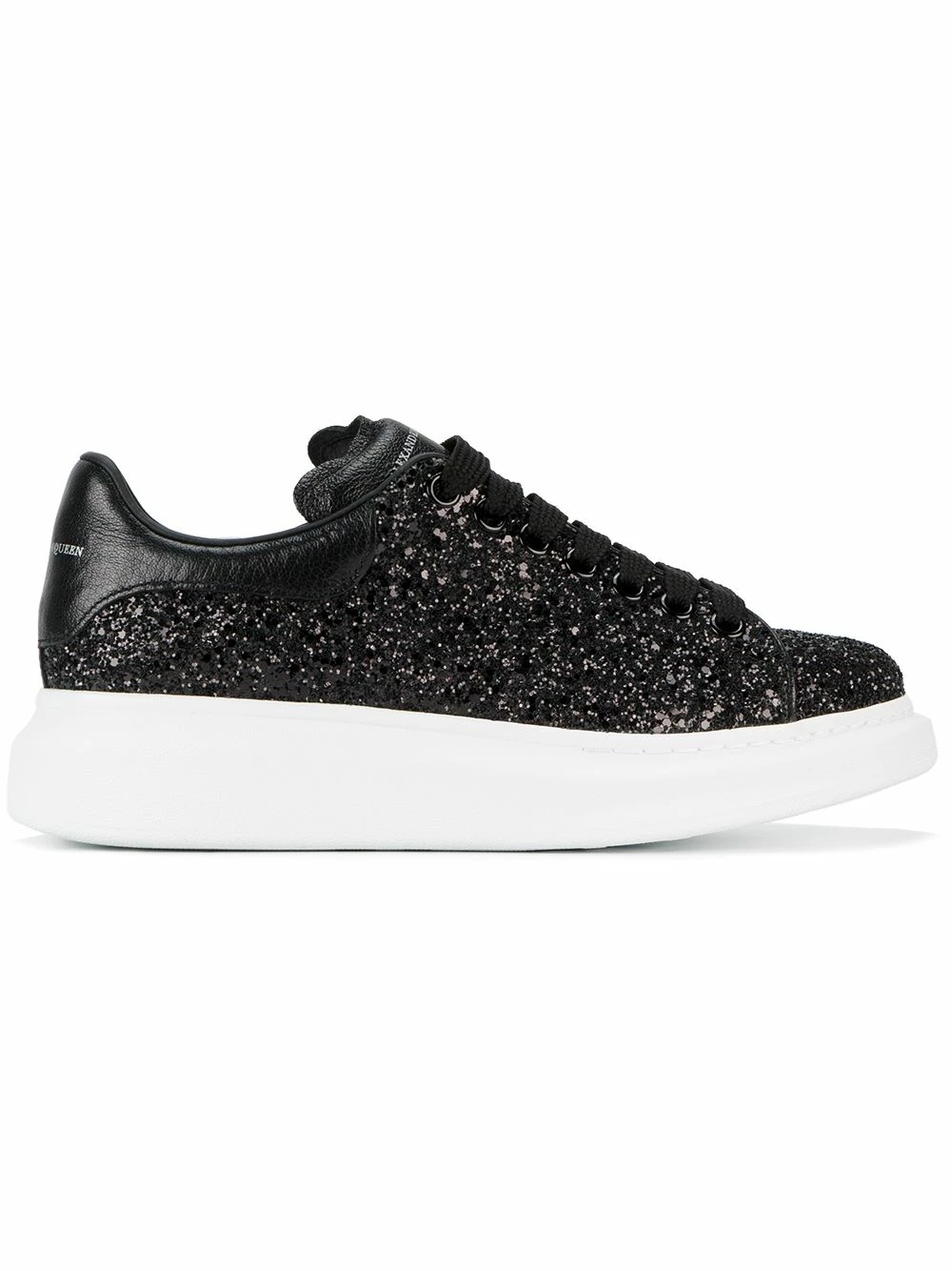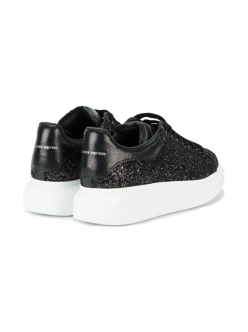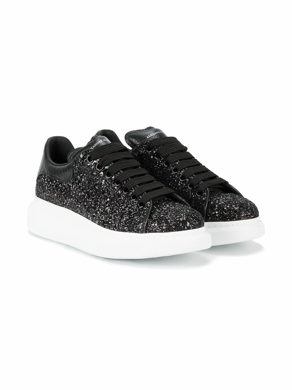 Black leather Black Glitter Platform Sneakers from Alexander McQueen featuring a lace-up front fastening, a brand embossed tongue, a round toe and an extended white rubber sole.