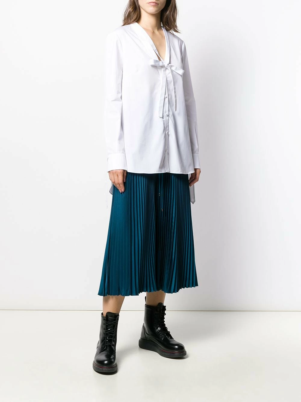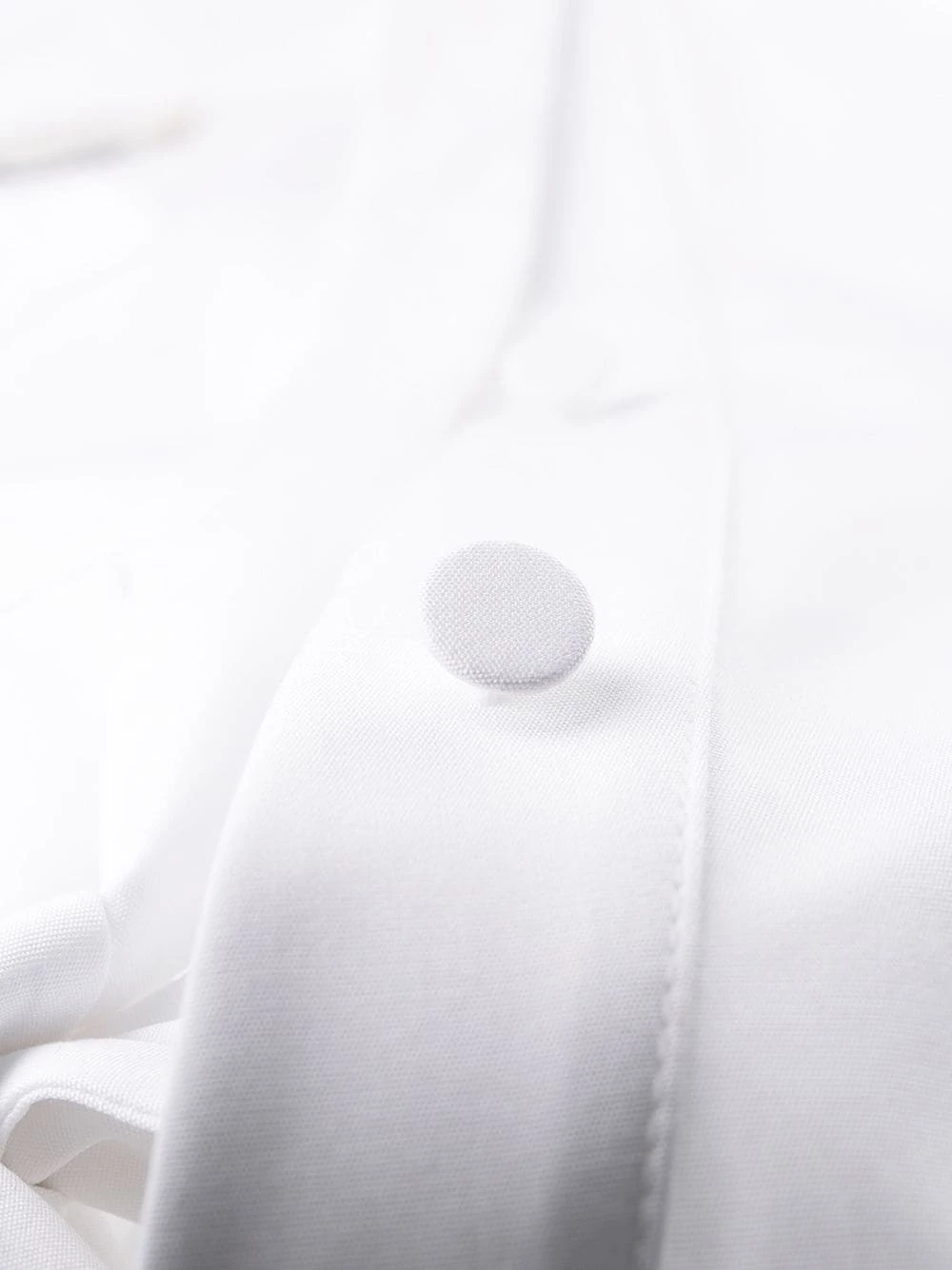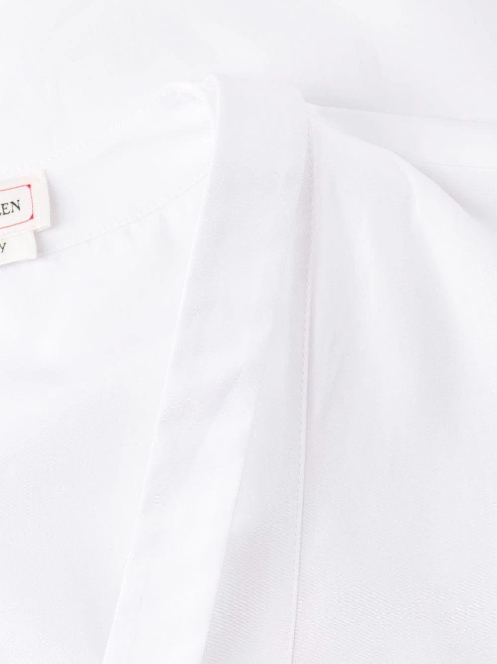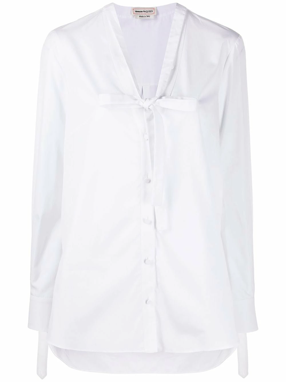 Restlessly inserting light punk rock references to traditional pieces, Alexander McQueen’s design embodies attitude and provoking statements as showcased with this optical white cotton bow detail shirt. Featuring a v-neck, long sleeves and a front button fastening.