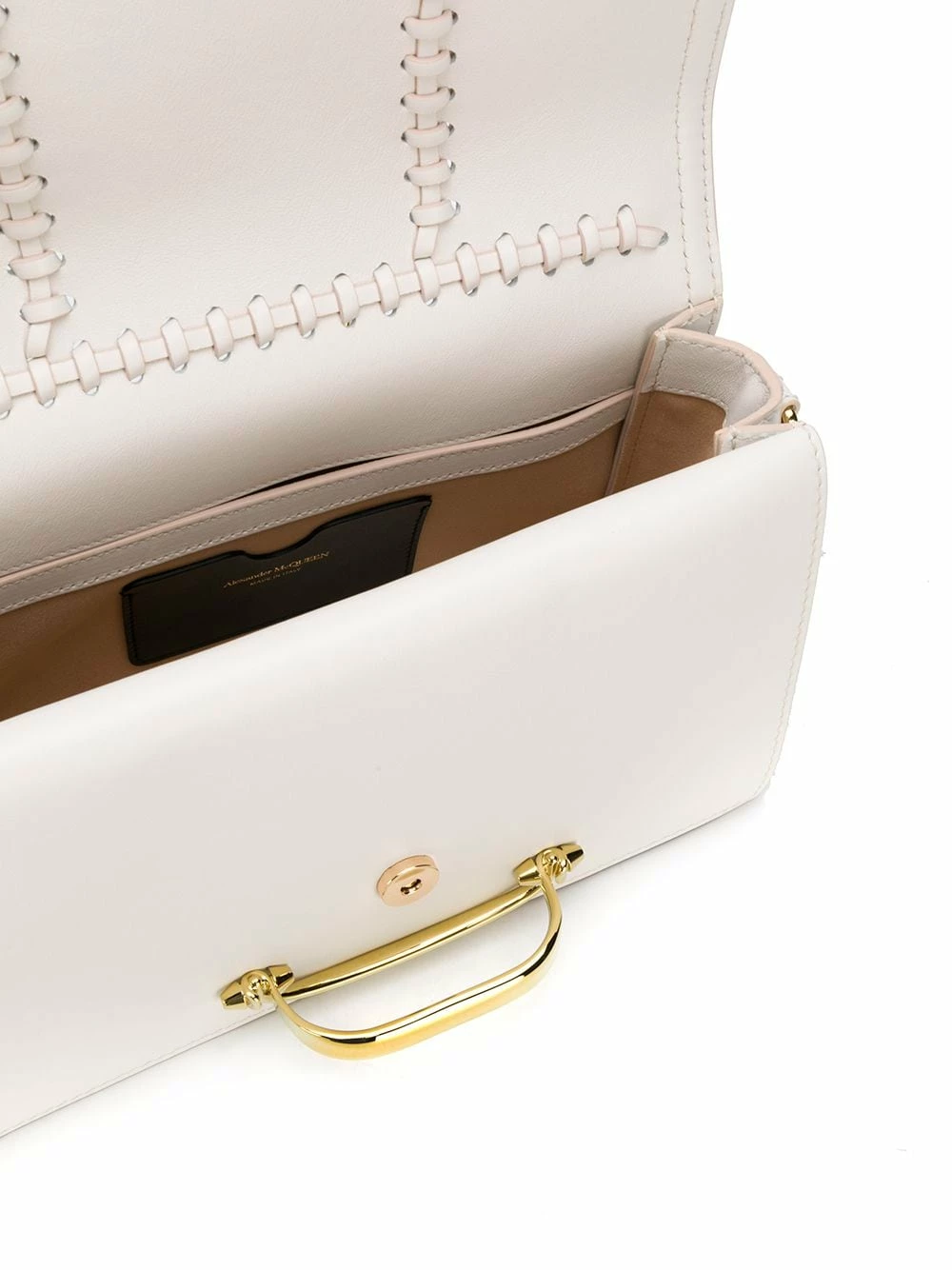 Keep things elegant. This white calf leather braid-detailed shoulder bag from Alexander McQueen strays away from the usual macabre side of the label. Everyone has two sides. Featuring a gold-tone chain shoulder strap, a front flap closure, a magnetic fastening, an internal slip pocket, a braided detail and gold-tone hardware.
