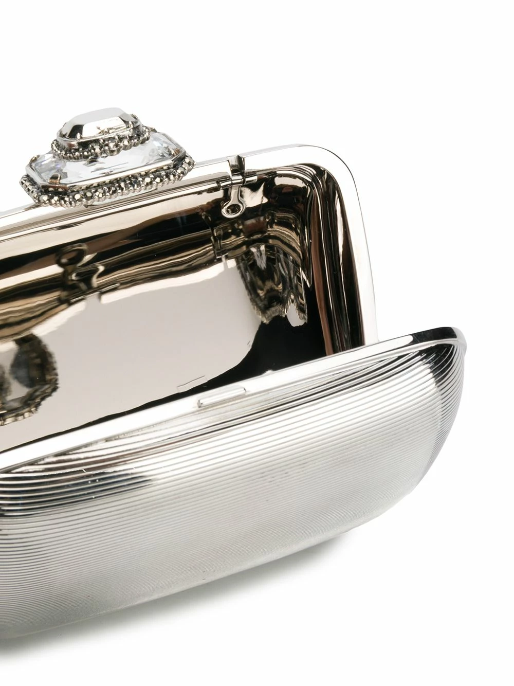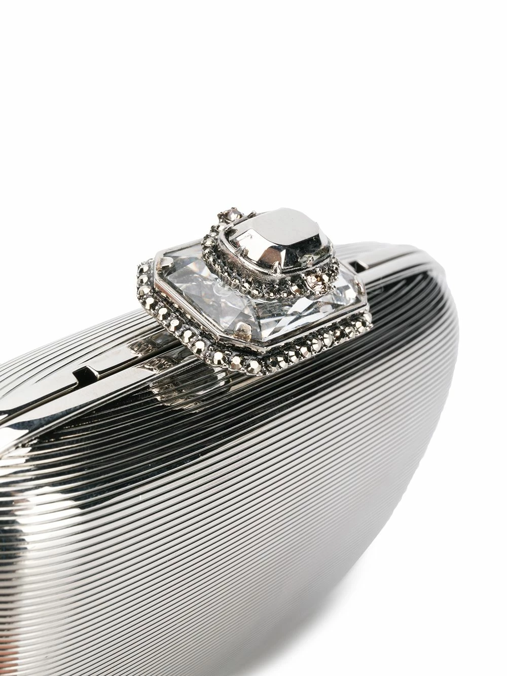 Alexander McQueen replaces gothic, dark romanticism for classic feminine designs in the new collection, as showcased by this silver-tone branded clutch bag. Featuring a main internal compartment, a detachable chain strap and an embellished top closure.
