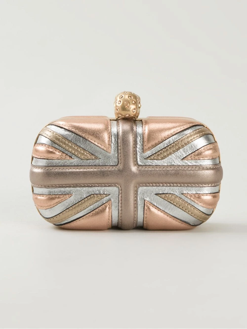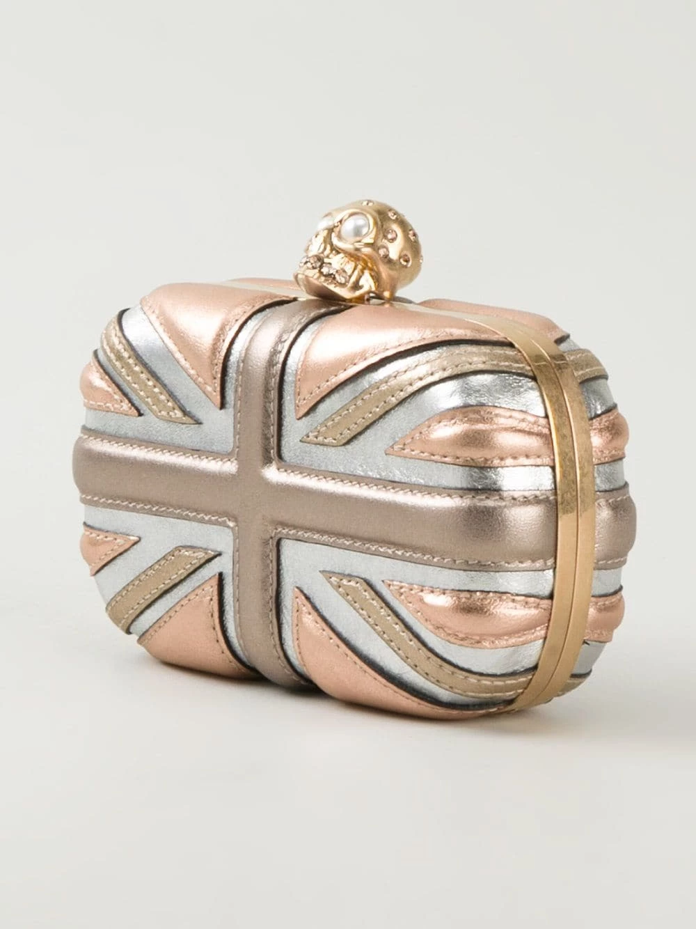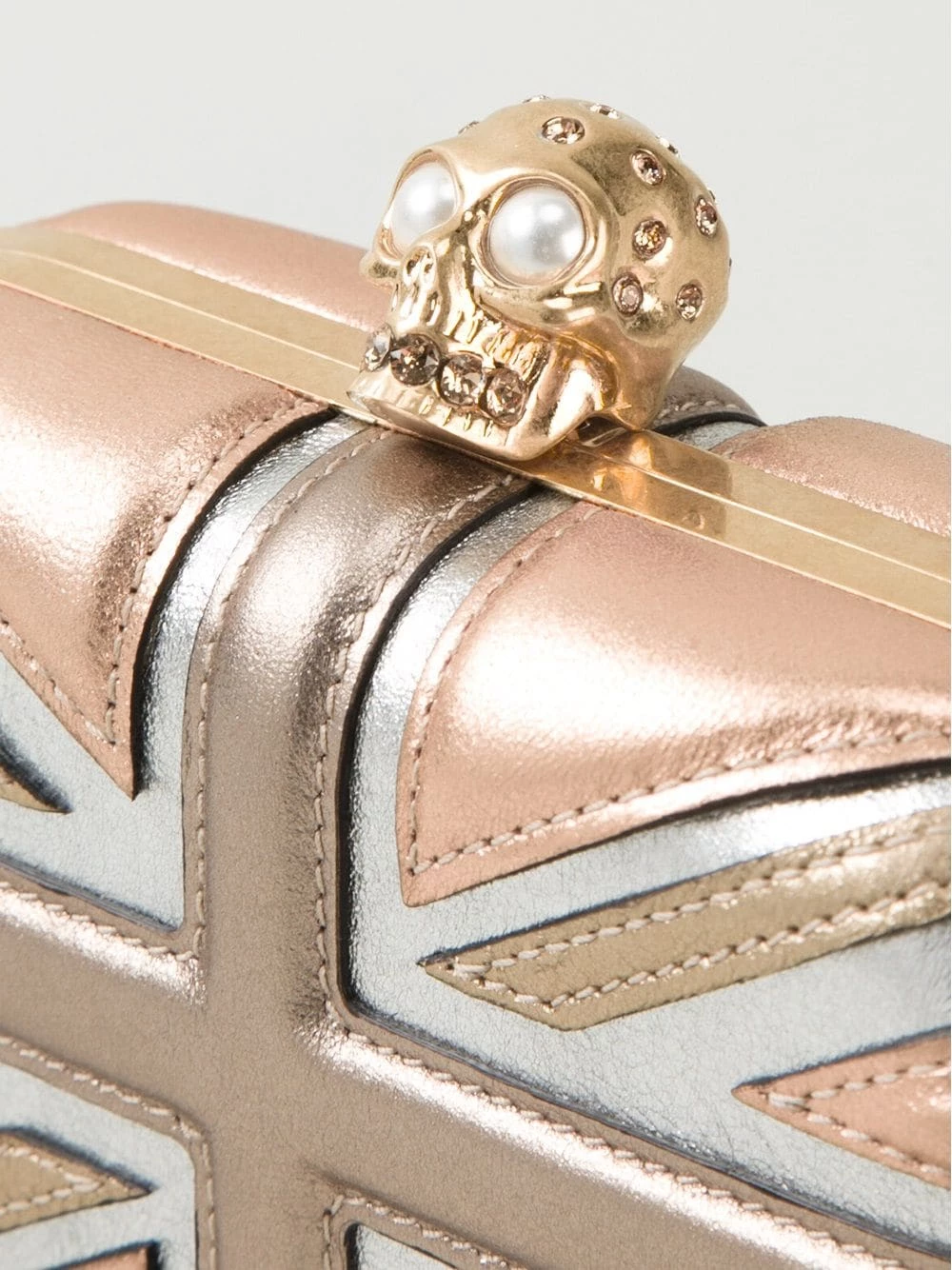 Grey and metallic pink lambskin ‘Britannia Skull’ box clutch from Alexander McQueen featuring a crystal embellished gold-tone skull clasp closure.