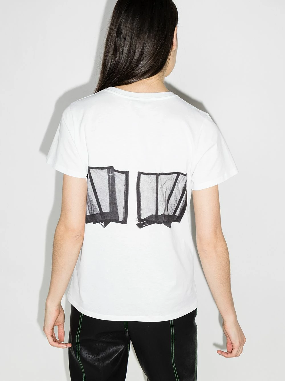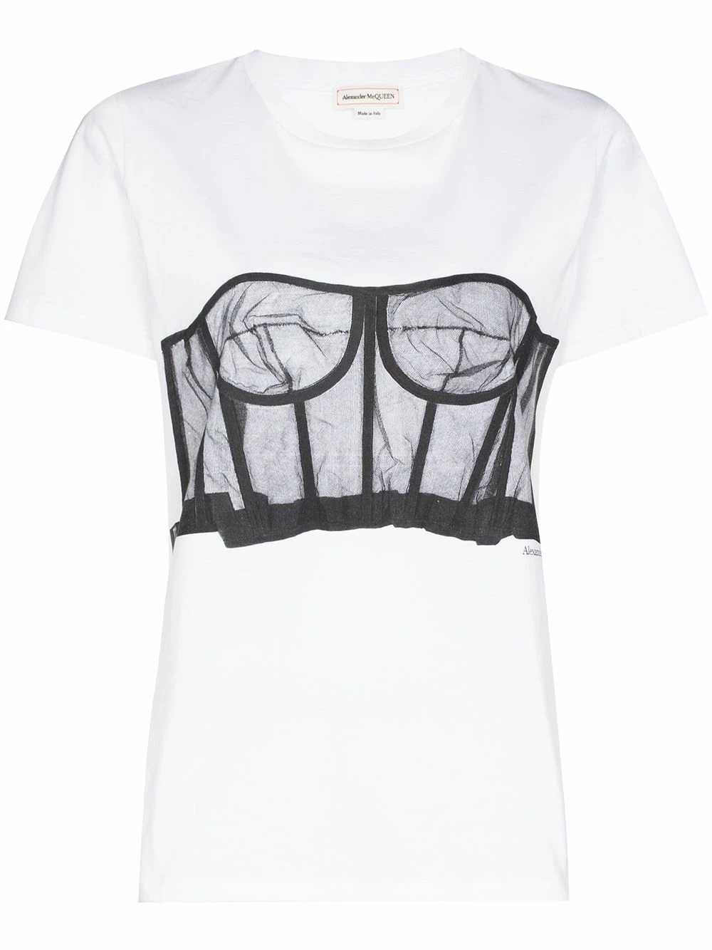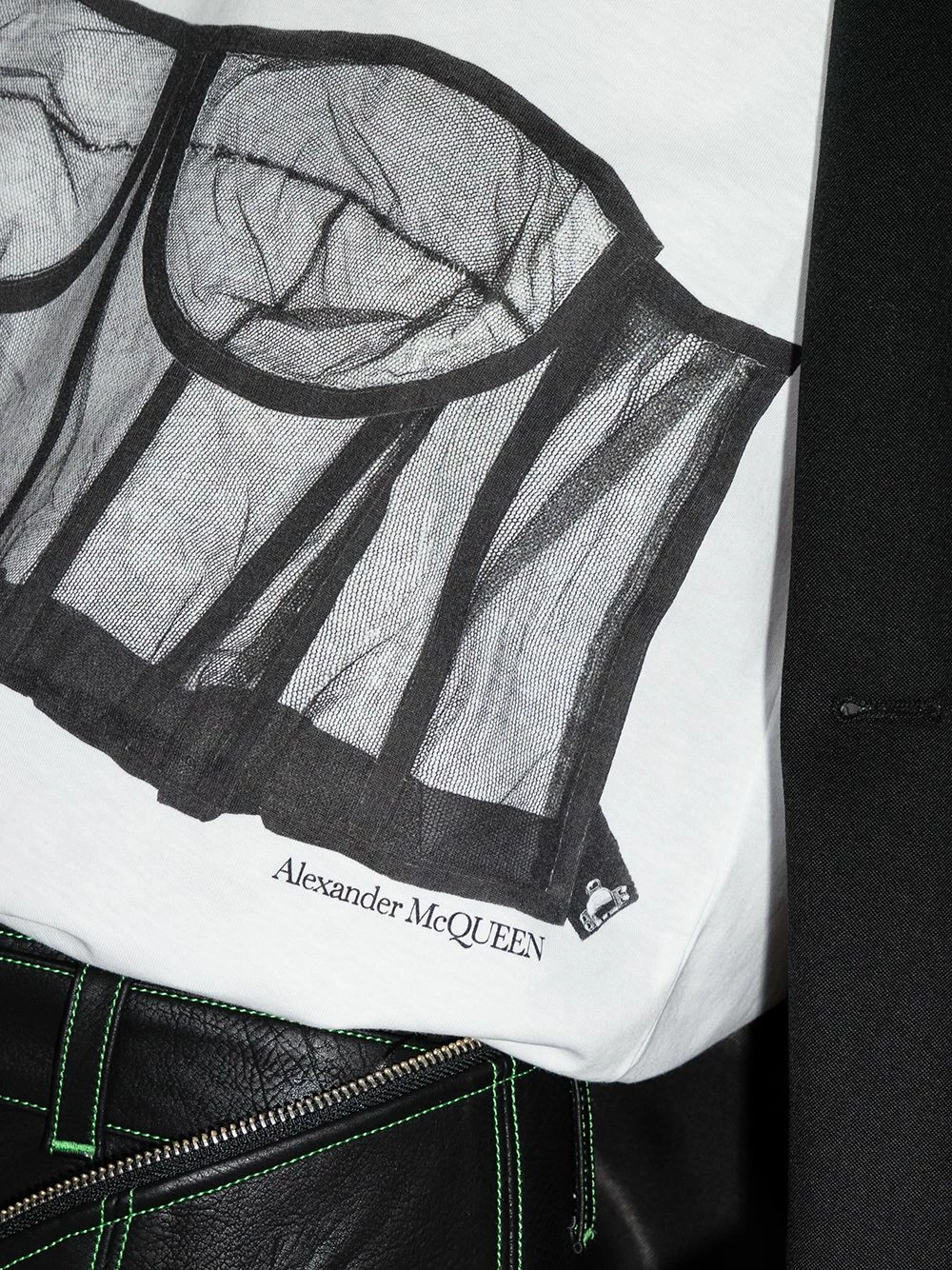 They say it’s what’s underneath that counts. Well, not when it comes to Alexander McQueen. Constructed from white cotton, this short-sleeve T-shirt boasts a black bustier print that will prove otherwise. Let it show.