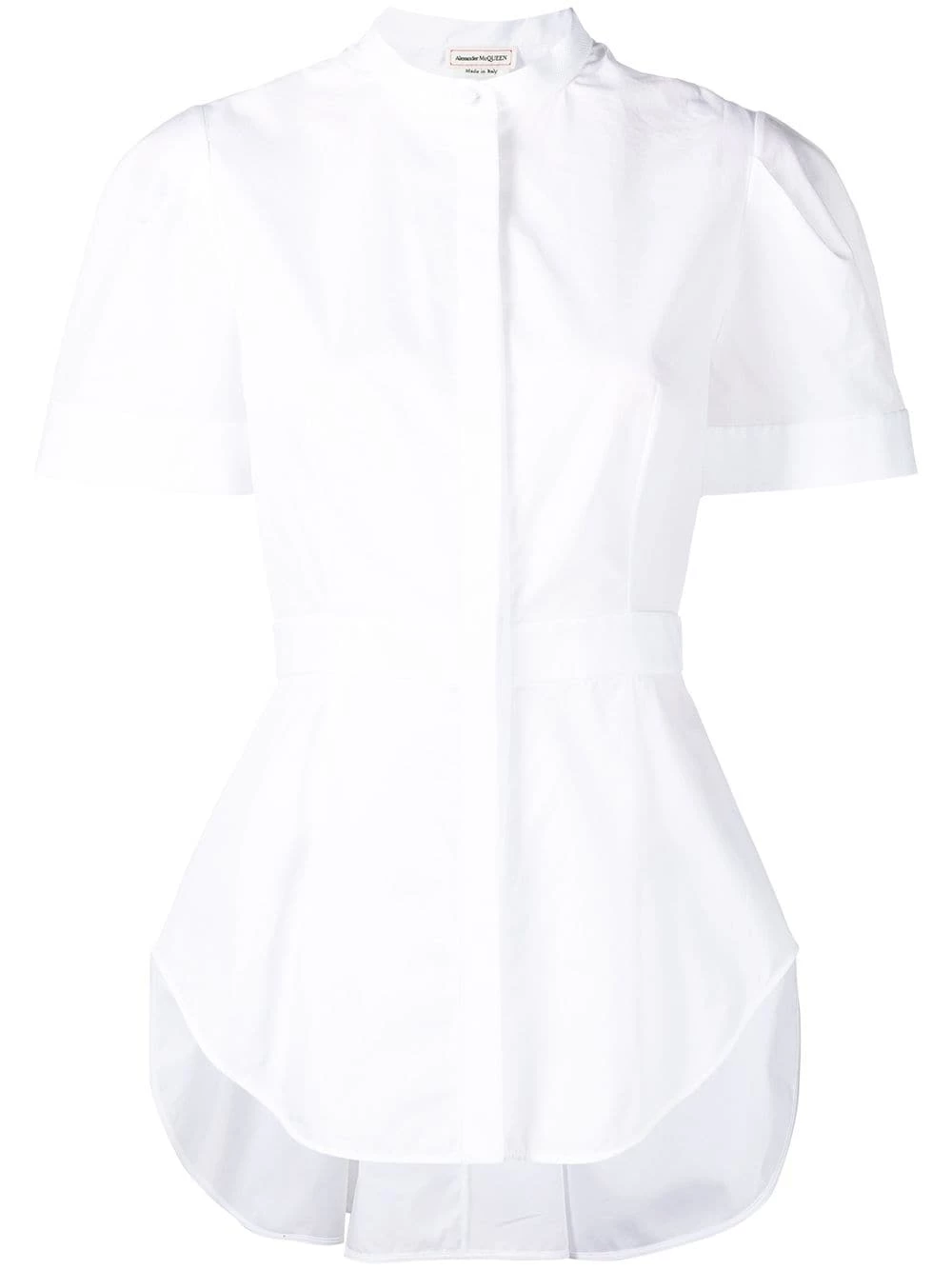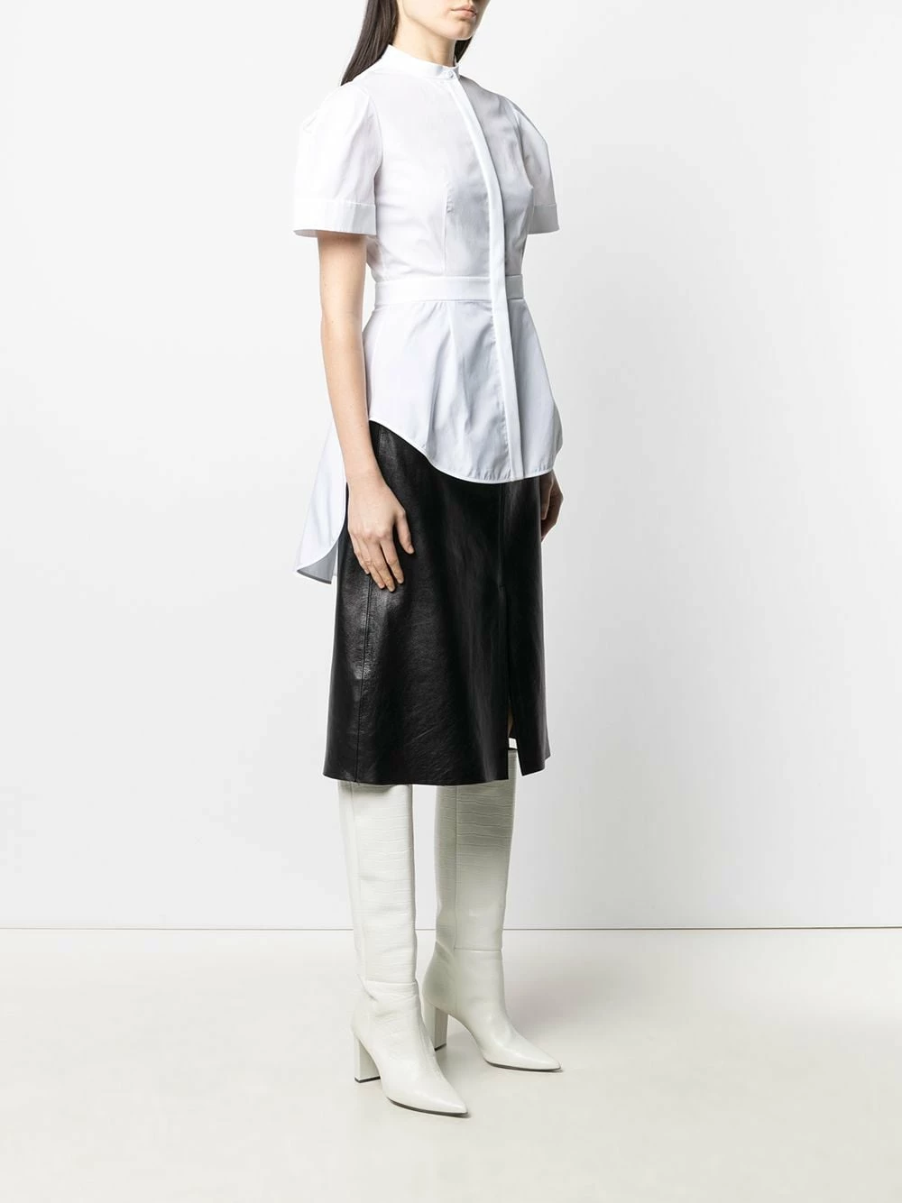 Add a contemporary touch. This collarless shirt from Alexander McQueen stands out due to its unexpected pleat detailing. You’ll plan look after look around it.