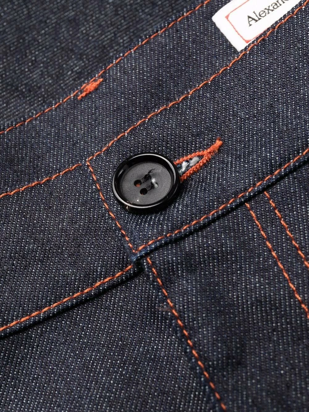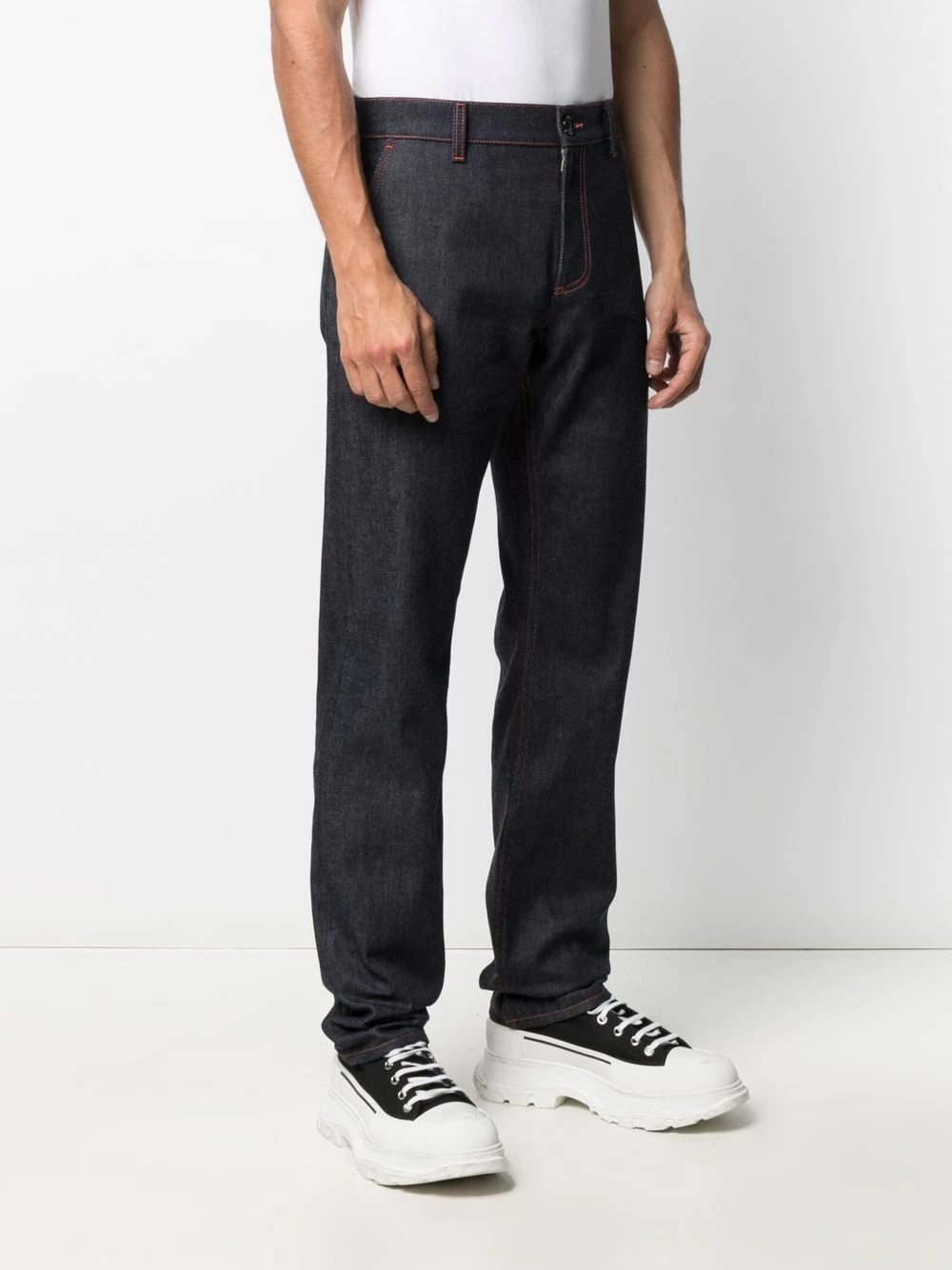 It’s always the small things that make the big picture. Look closely to see the red contrast stitching on these elegant straight-leg jeans from Alexander McQueen. Every detail counts.