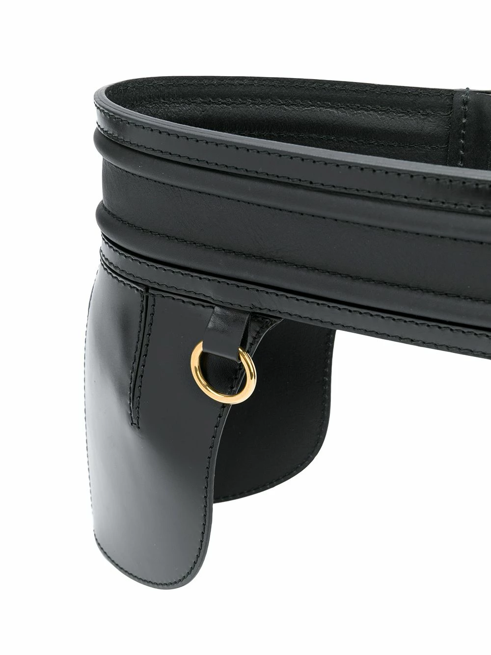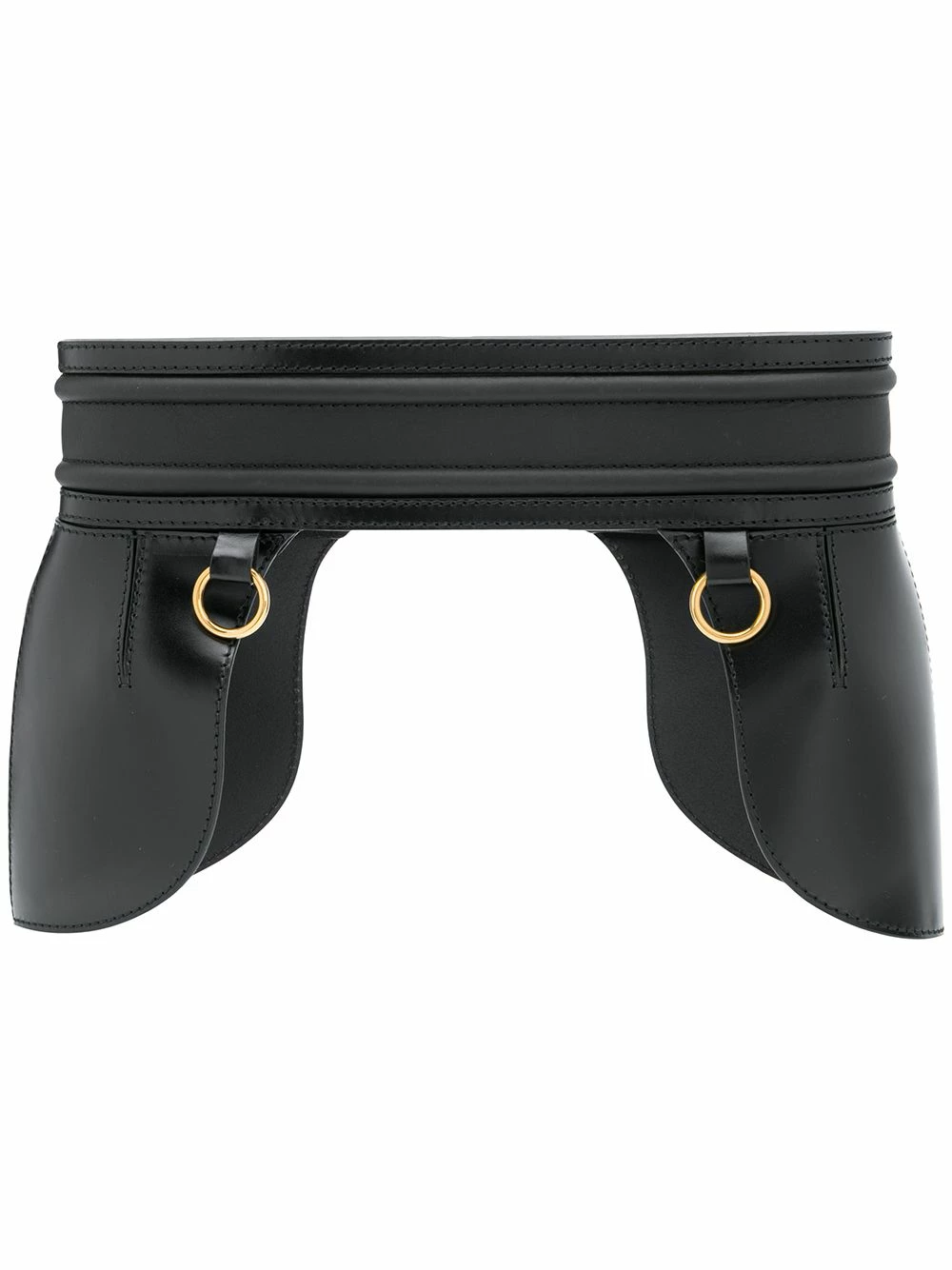 Feeling a bit bloated? Hide the bulge with this black calf leather corset belt from Alexander McQueen. Cinch your waist for a flattering fit. Featuring gold-tone rings.