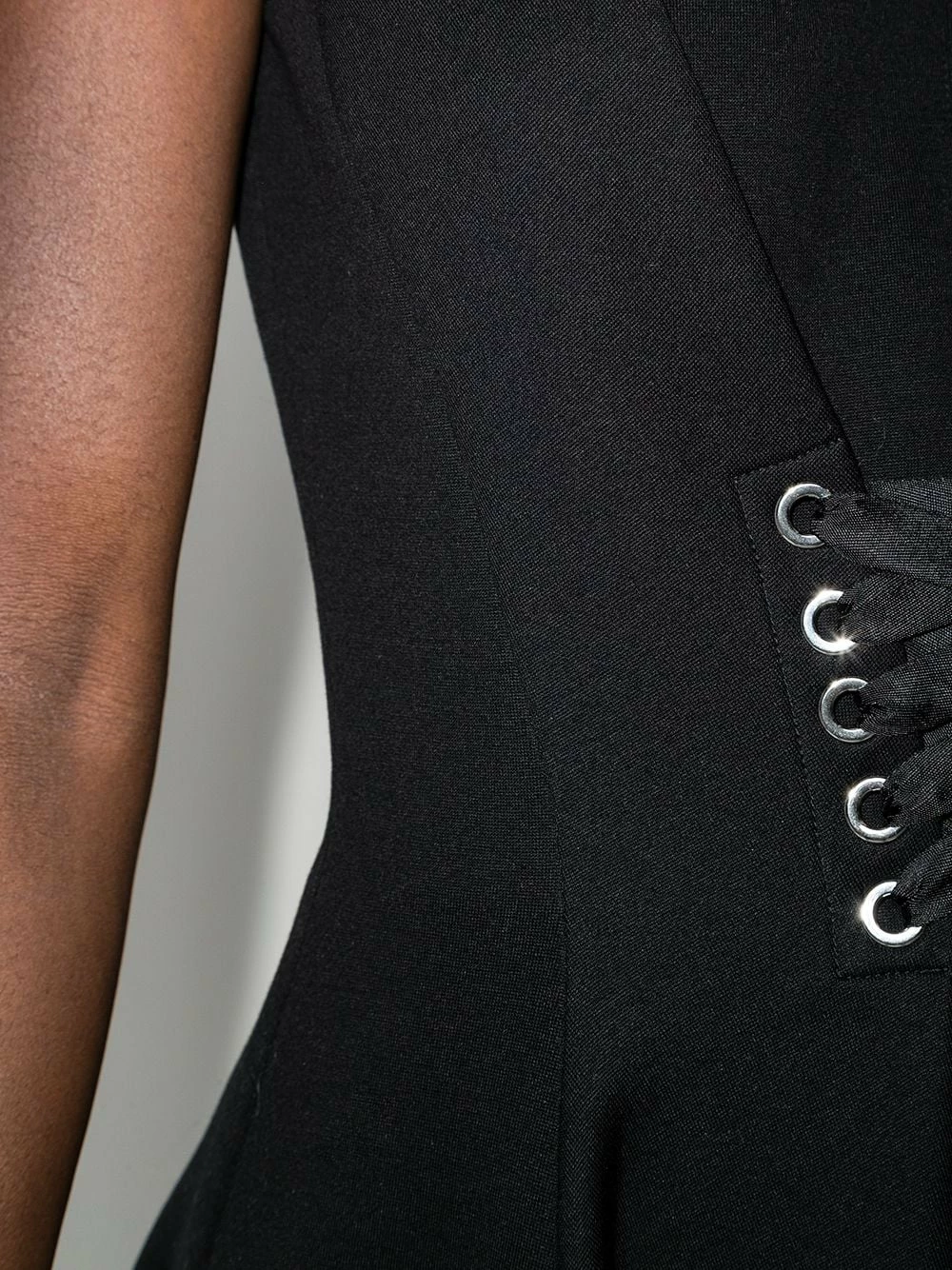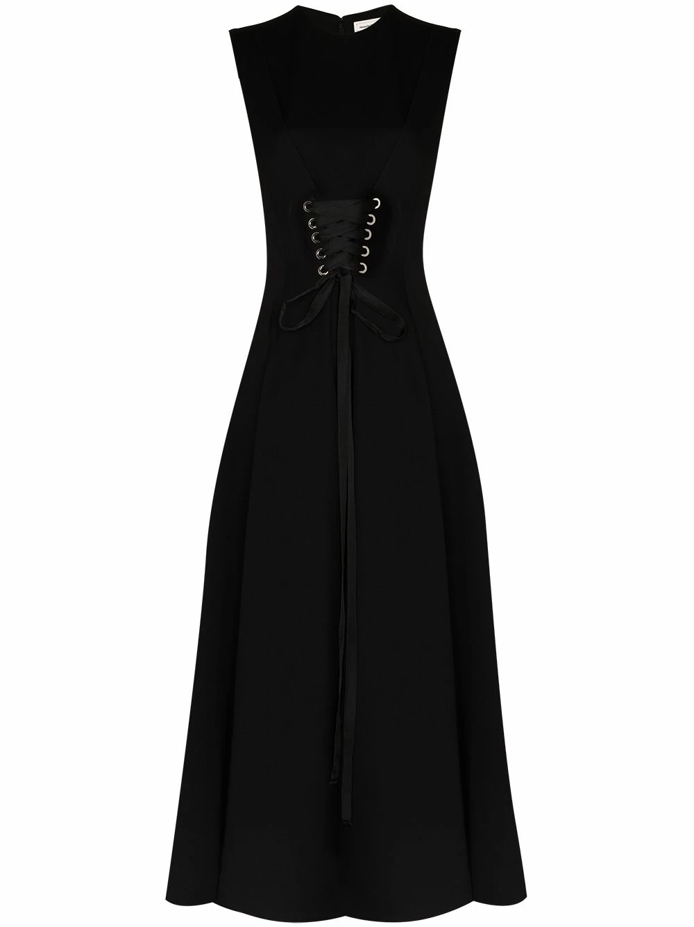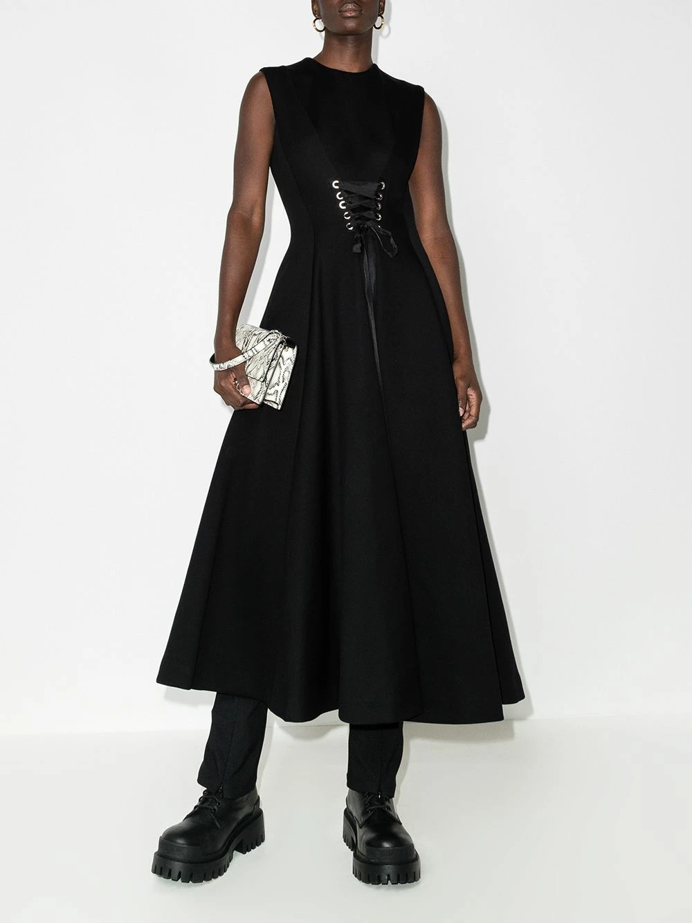 Evoking Alexander McQueen’s theatrical aesthetic, this mid-length dress features a corset-style lace-up fastening at the front and a flared silhouette that elevates its all-black design.Â
