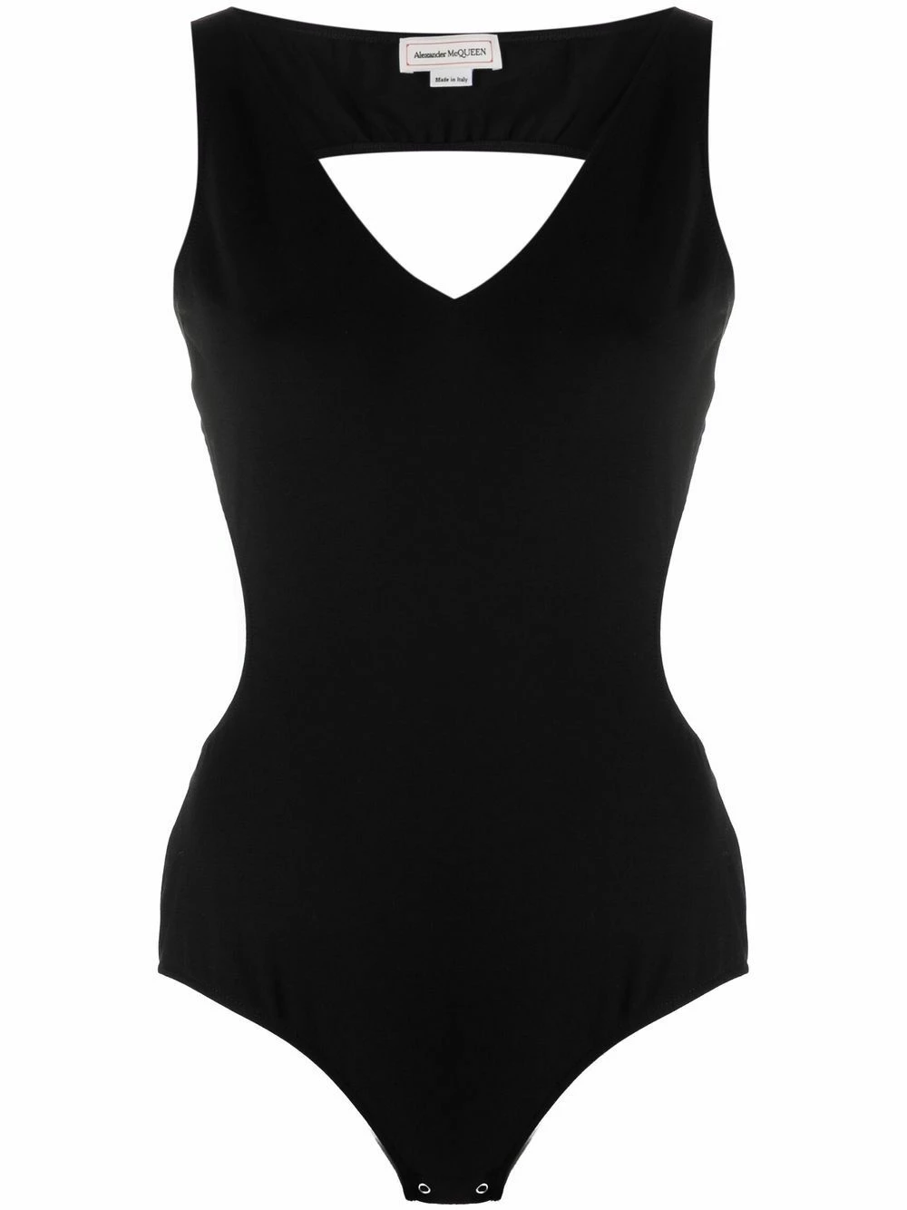 Jet-black cut out-detail sleeveless top from Alexander McQueen featuring fine knit, cut-out detailing, V-neck and sleeveless.
