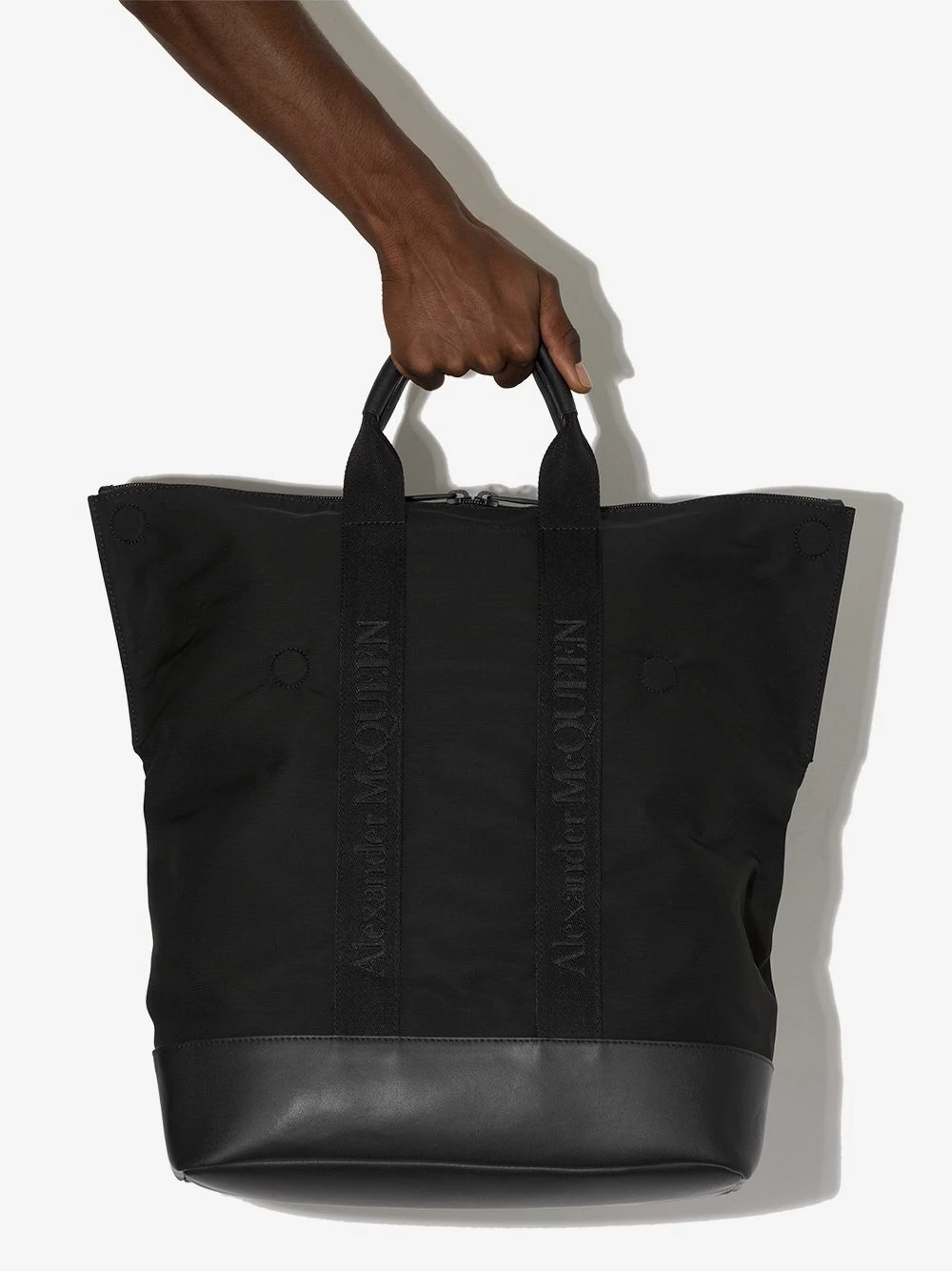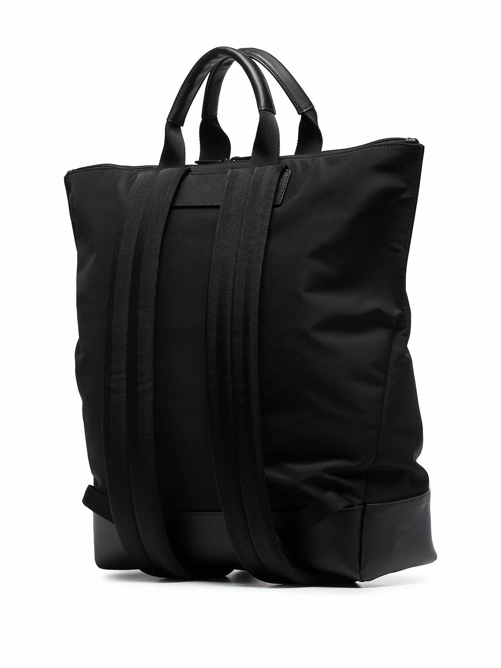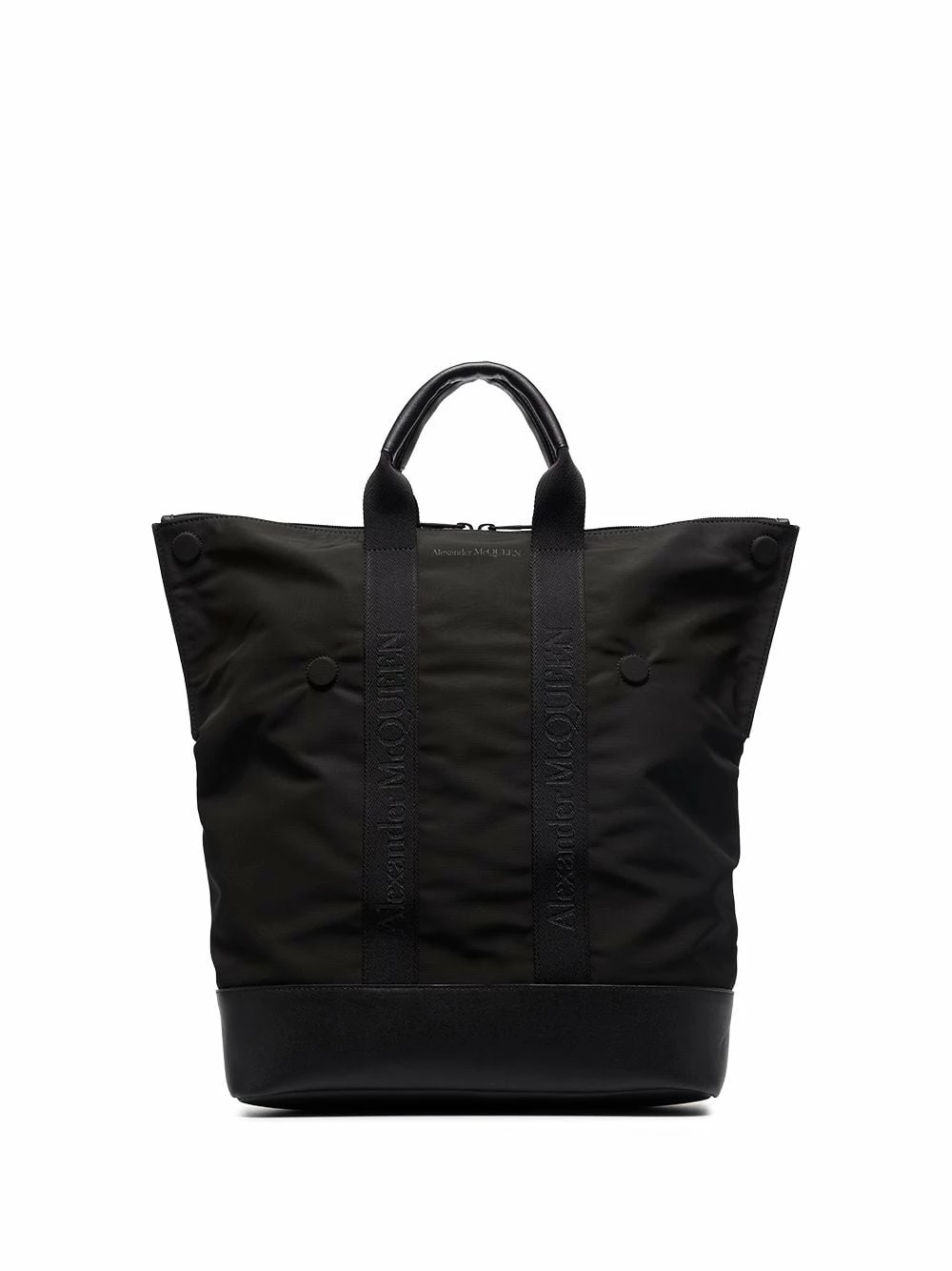 This iteration of Alexander McQueen’s De Manta backpack is cast in a sleek all-black palette and retains the signature top handles that allow it to be carried as a shopper bag.