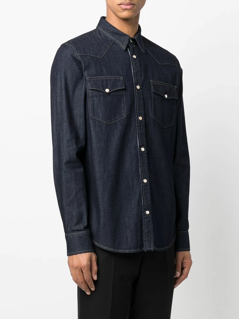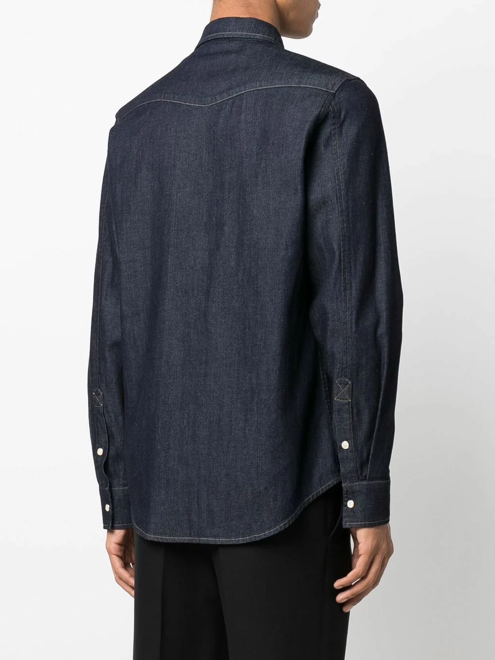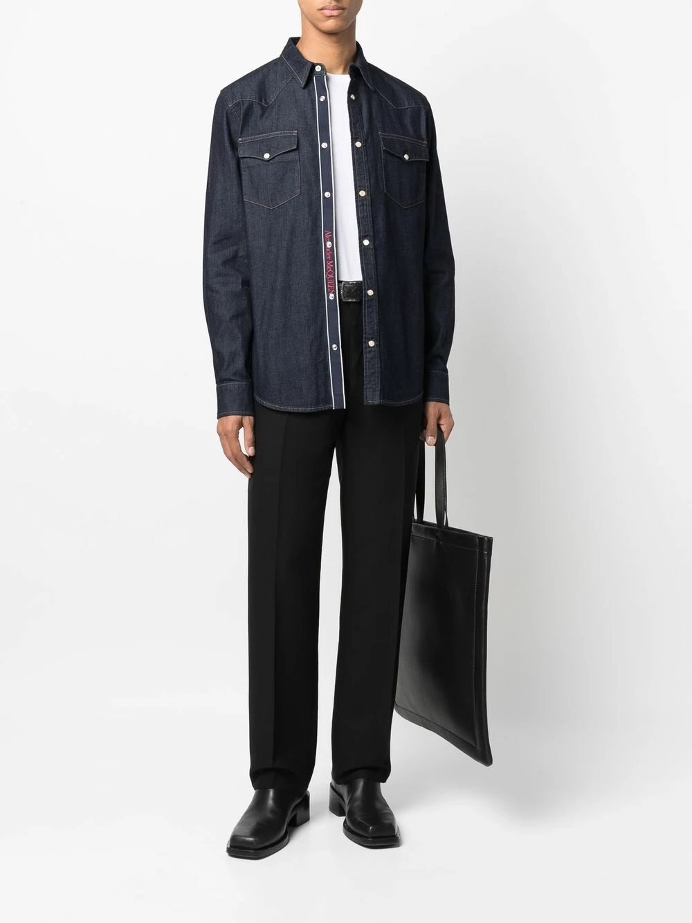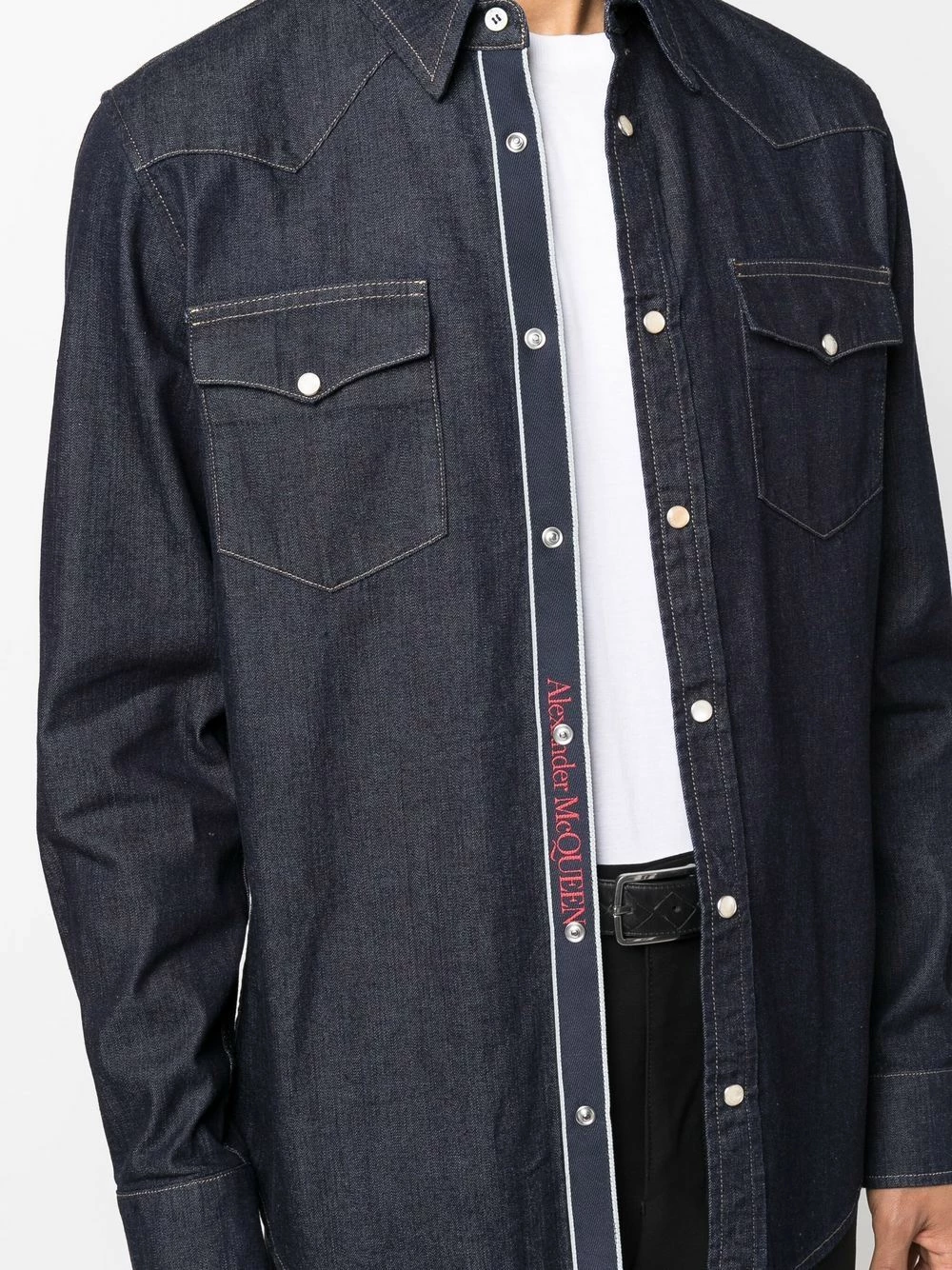 Made from sturdy denim, this dark blue shirt from Alexander McQueen has contrast stitching and a curved hem for a casual silhouette. The inner press-stud placket is adorned with logo lettering.
