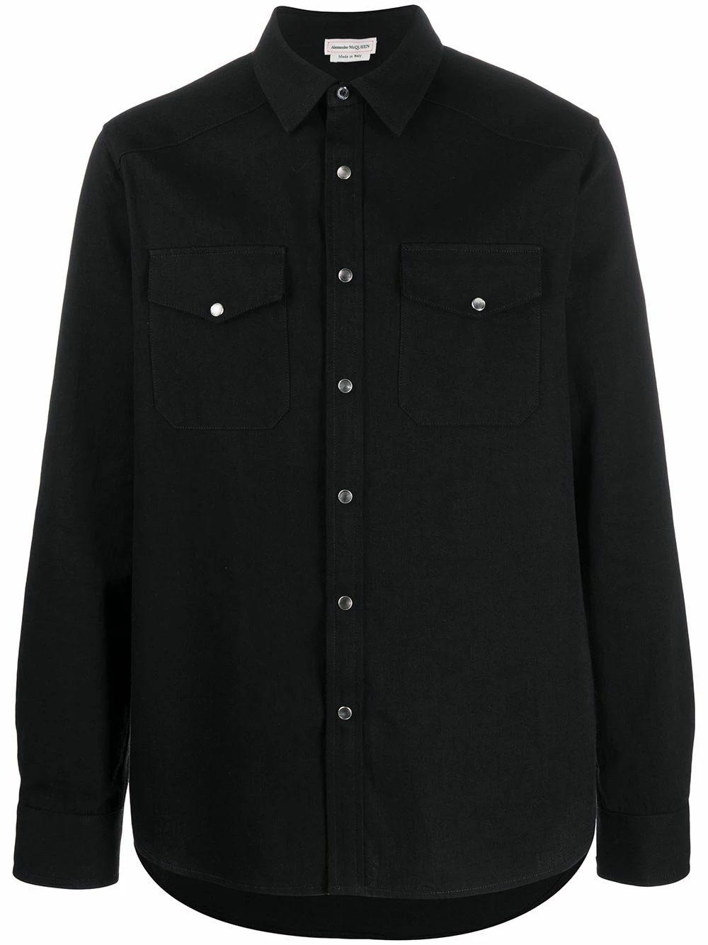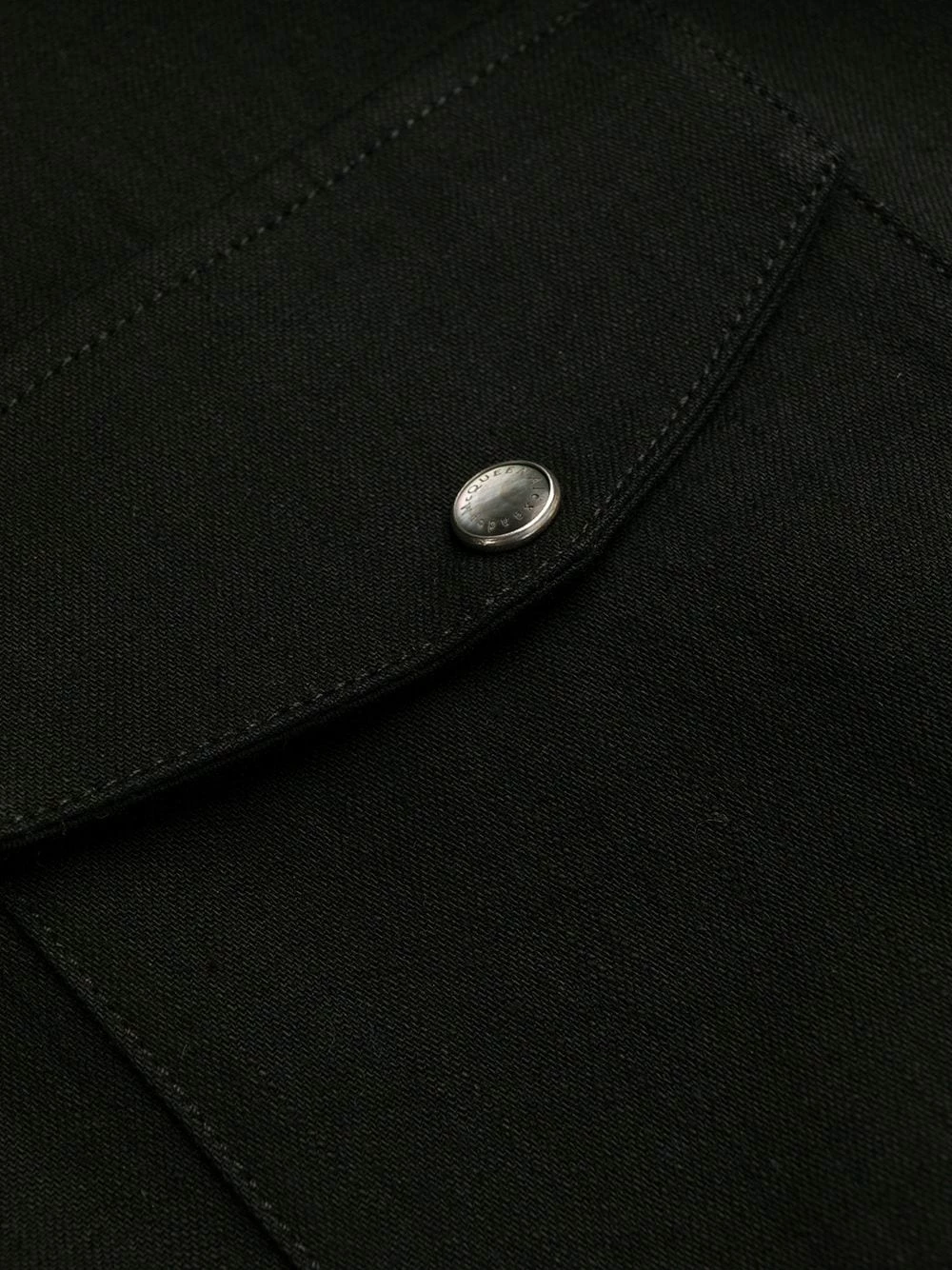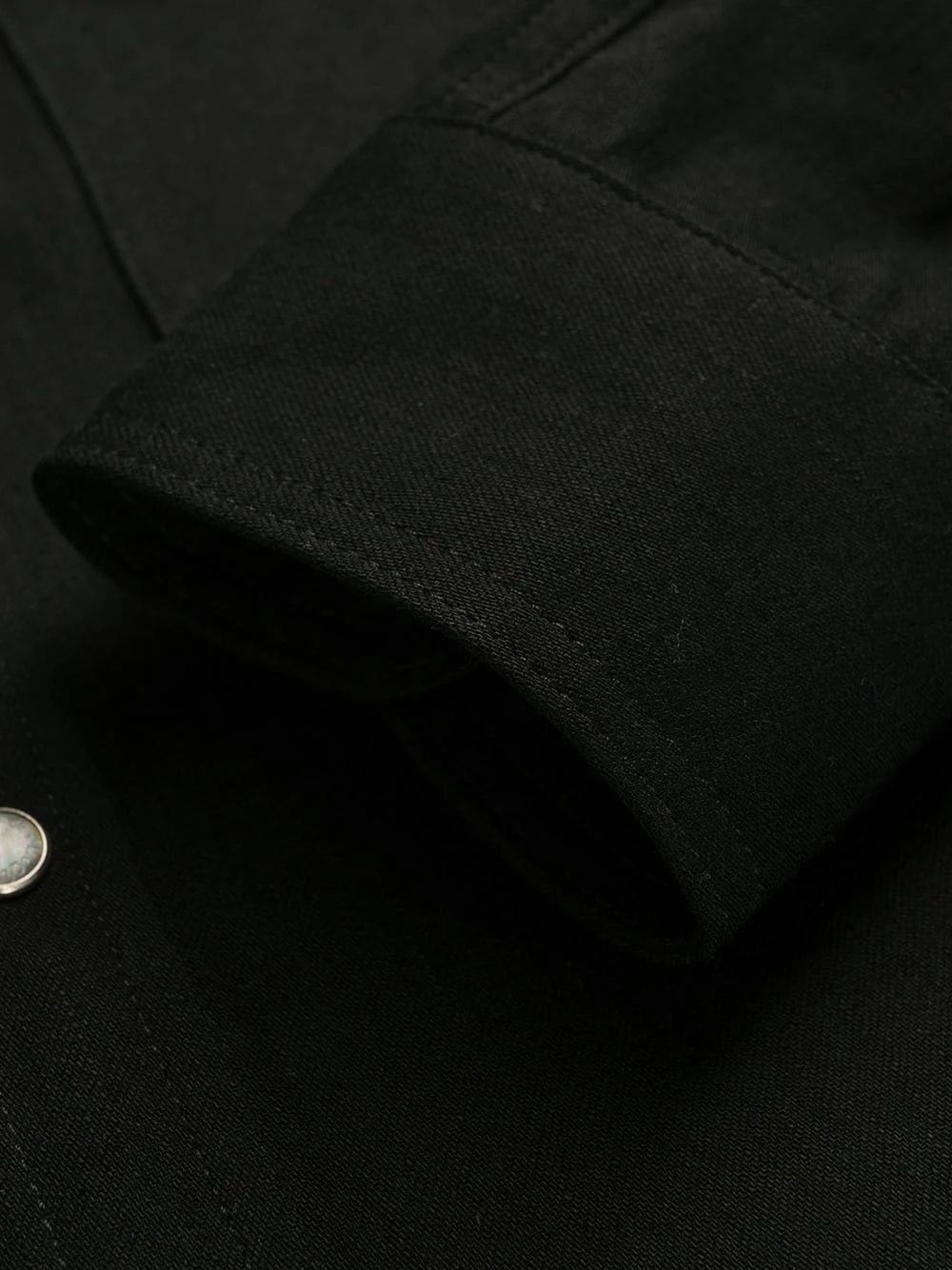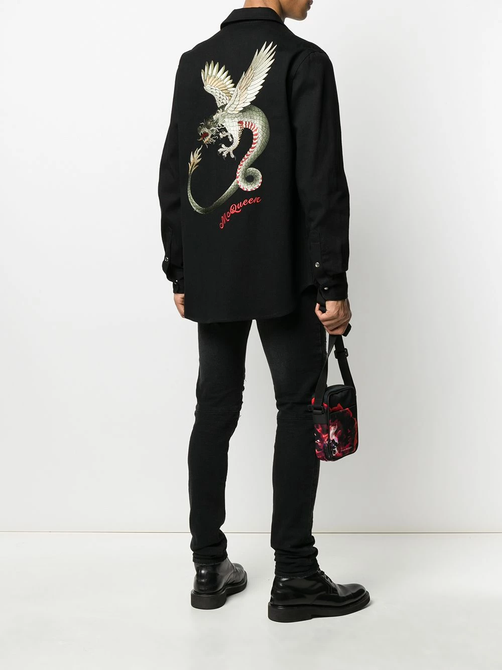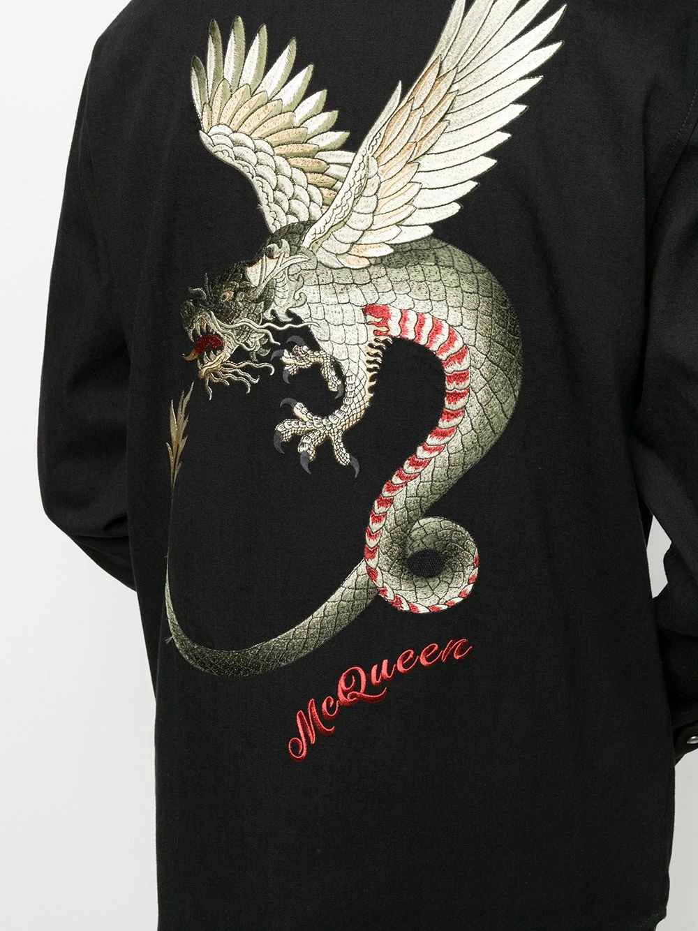 Black denim jacket with embroidery from Alexander McQueen featuring a classic collar, a button fastening, pockets at the chest and a dragon embroidery on the back.