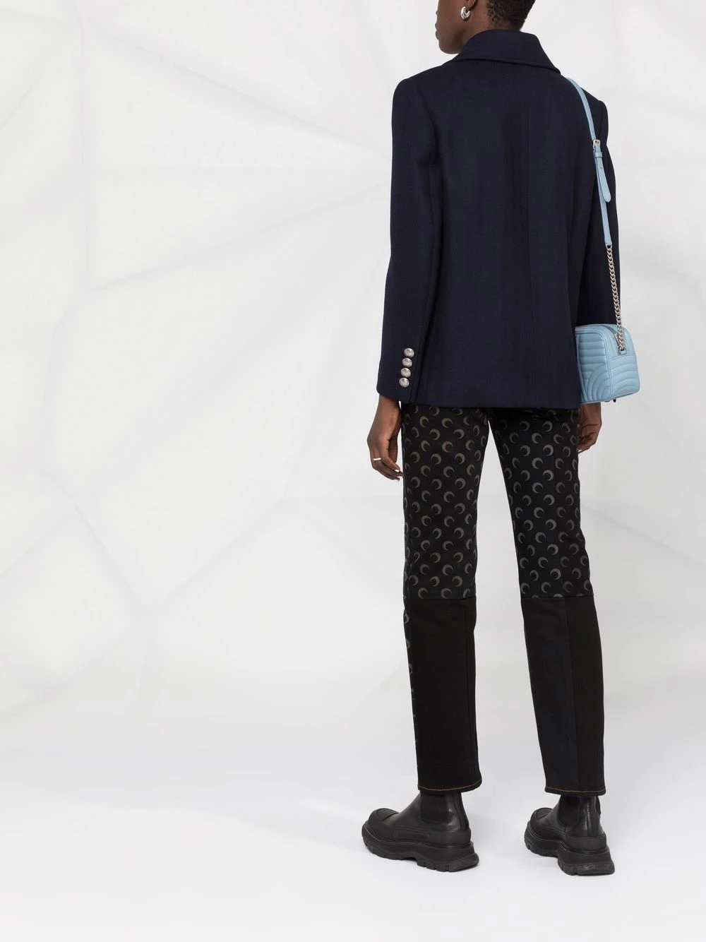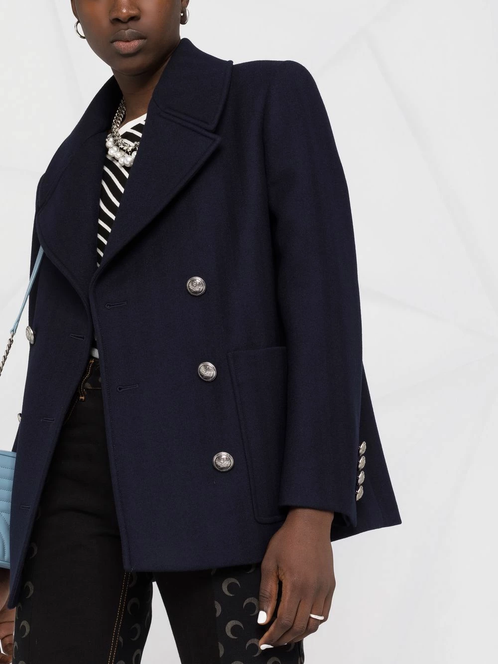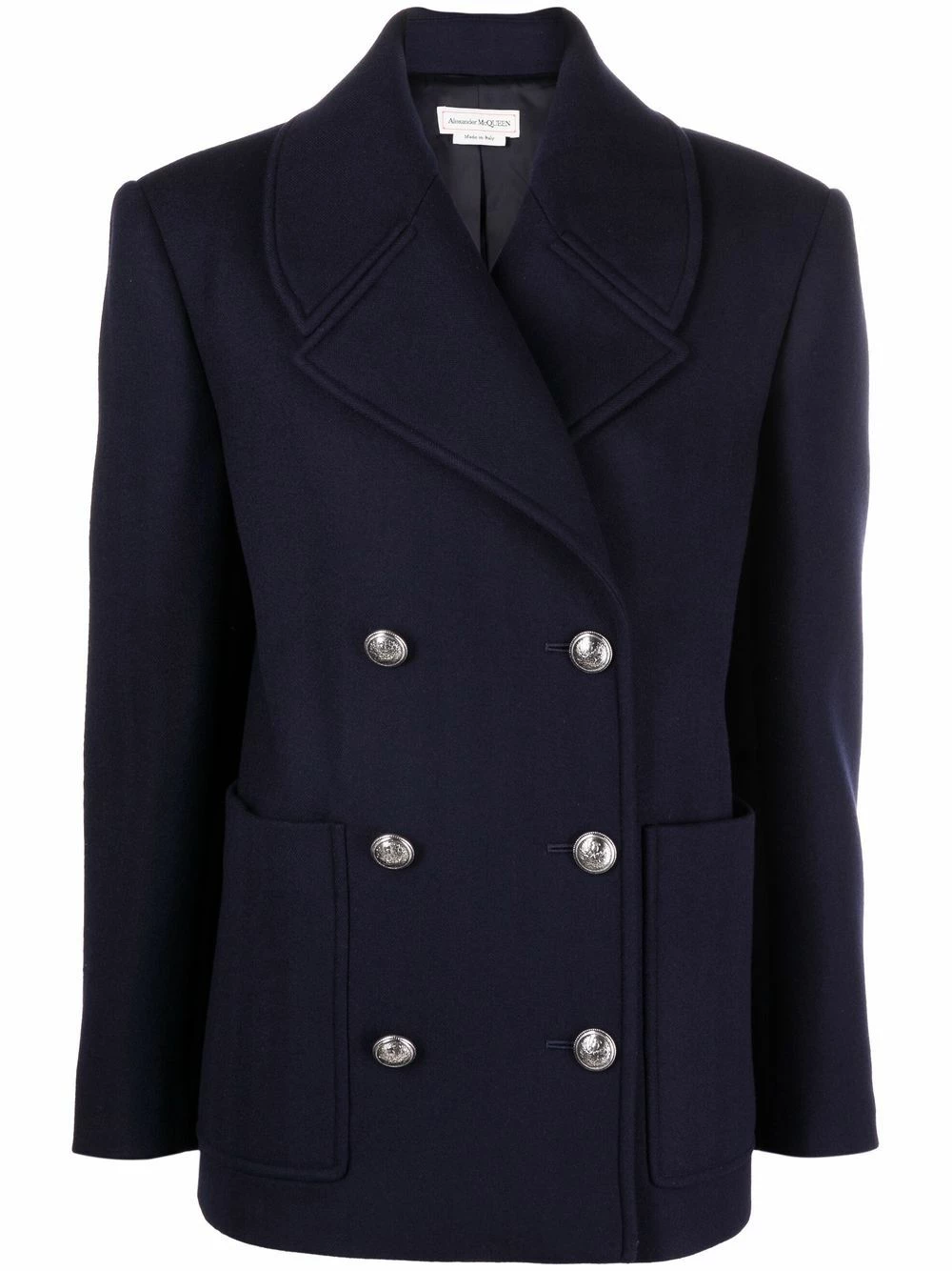 Alexander McQueen’s coat showcases the British brand’s tailoring expertise. Crafted from wool with a touch of cashmere, this navy iteration is designed with modern notched lapels in a sleek double-breasted silhouette.