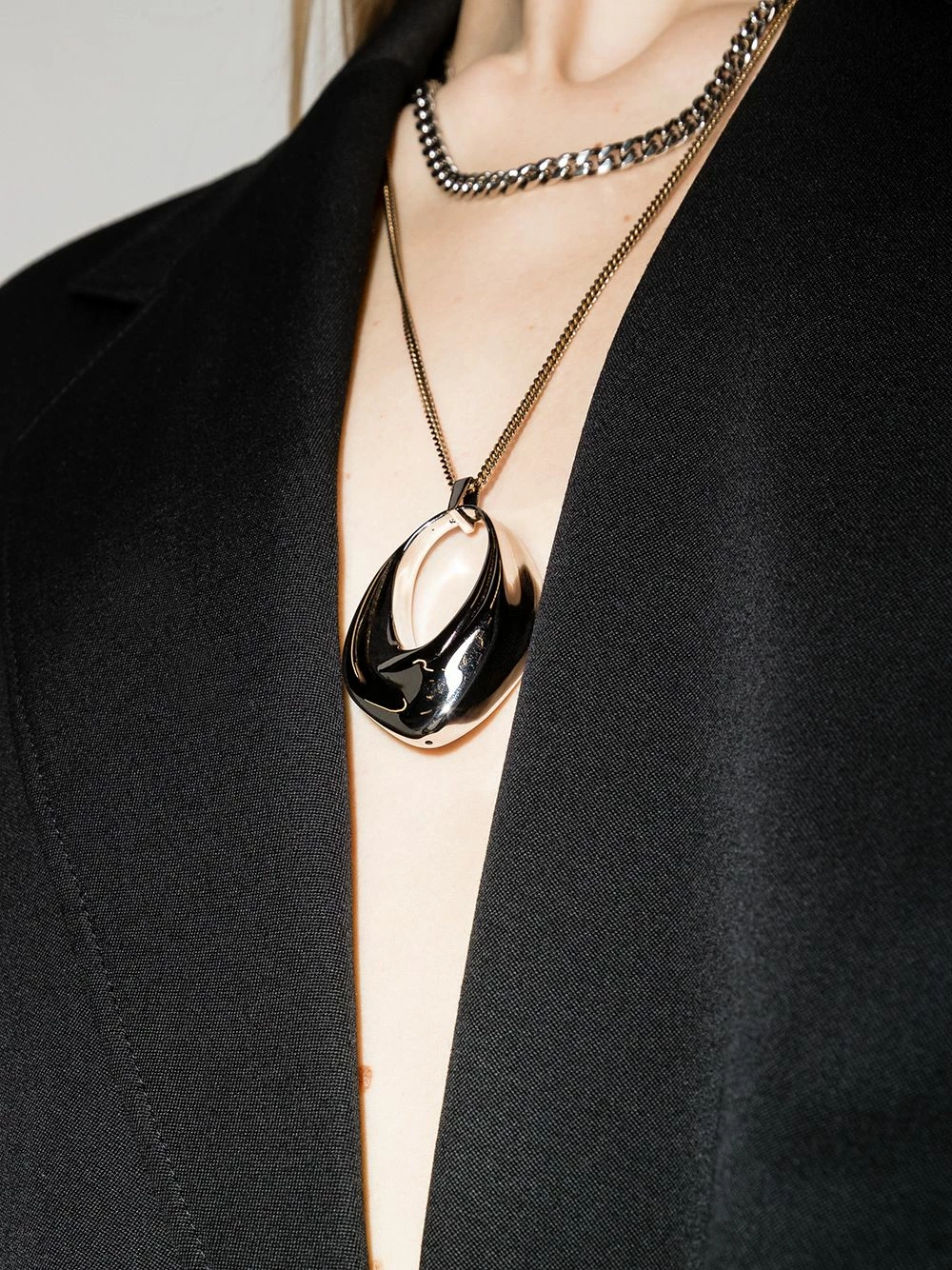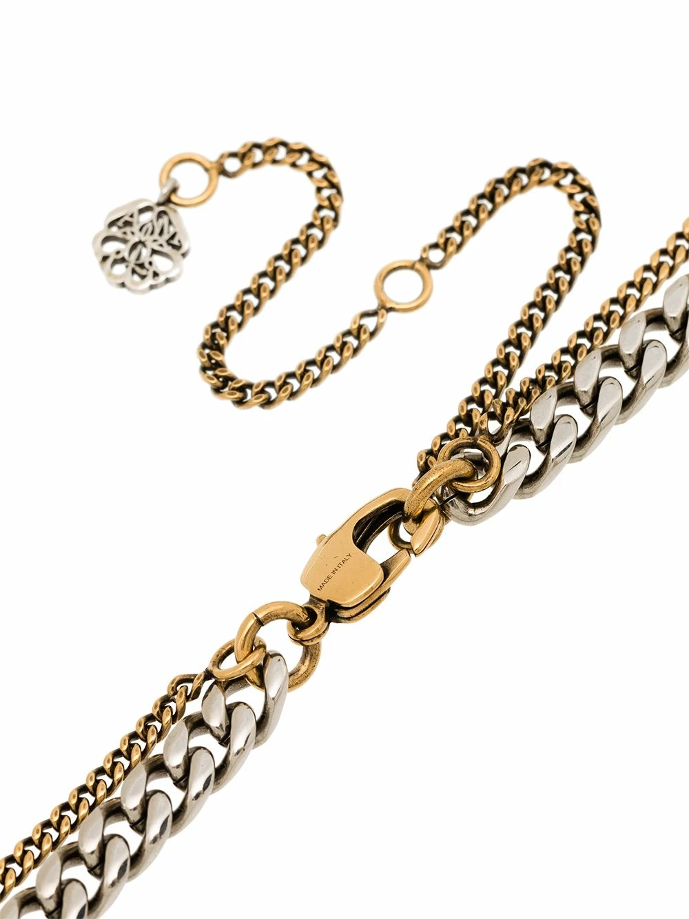 Leave it to Alexander McQueen to add some drama to your looks. In a two-tone design, this necklace features a statement pendant hanging from two chains, creating a layered effect. Two for one.