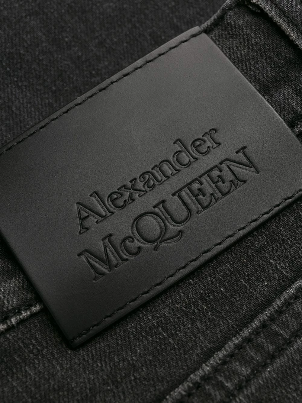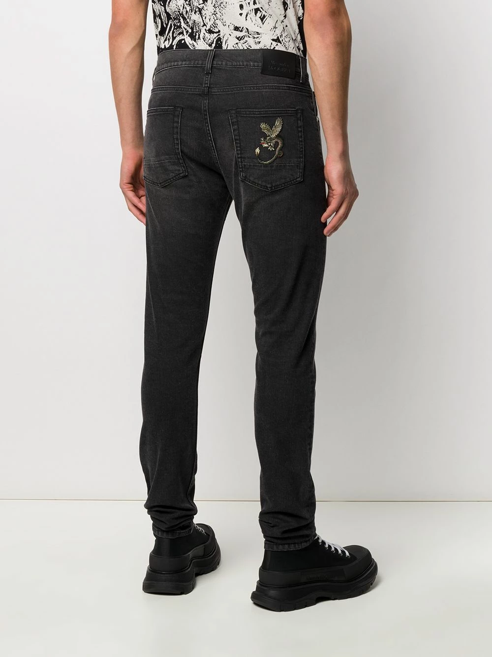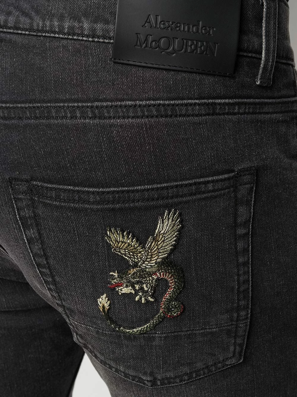 Fire in your belly and a dragon patch on your jeans. Symbols of supernatural power, strength and wisdom, the dragon patch applied to the rear pocket of these washed black cotton slim-fit jeans from Alexander McQueen make for a little added drama. Featuring a button and zip fly, belt loops, a five pocket design, a leather brand patch to the rear and appliqué detailing.