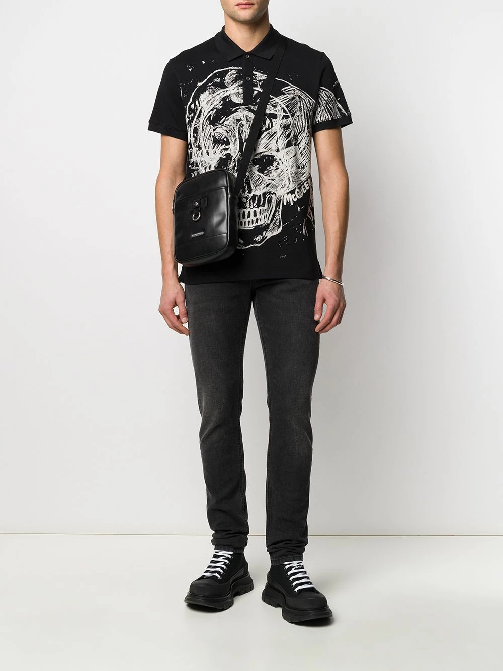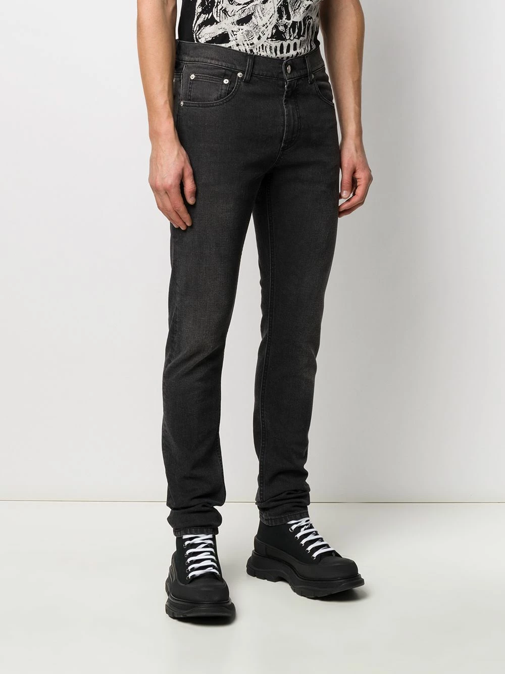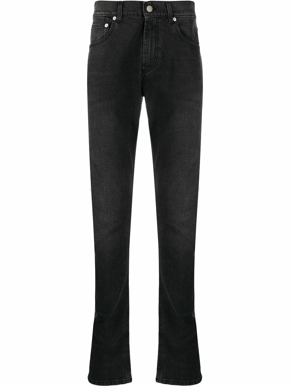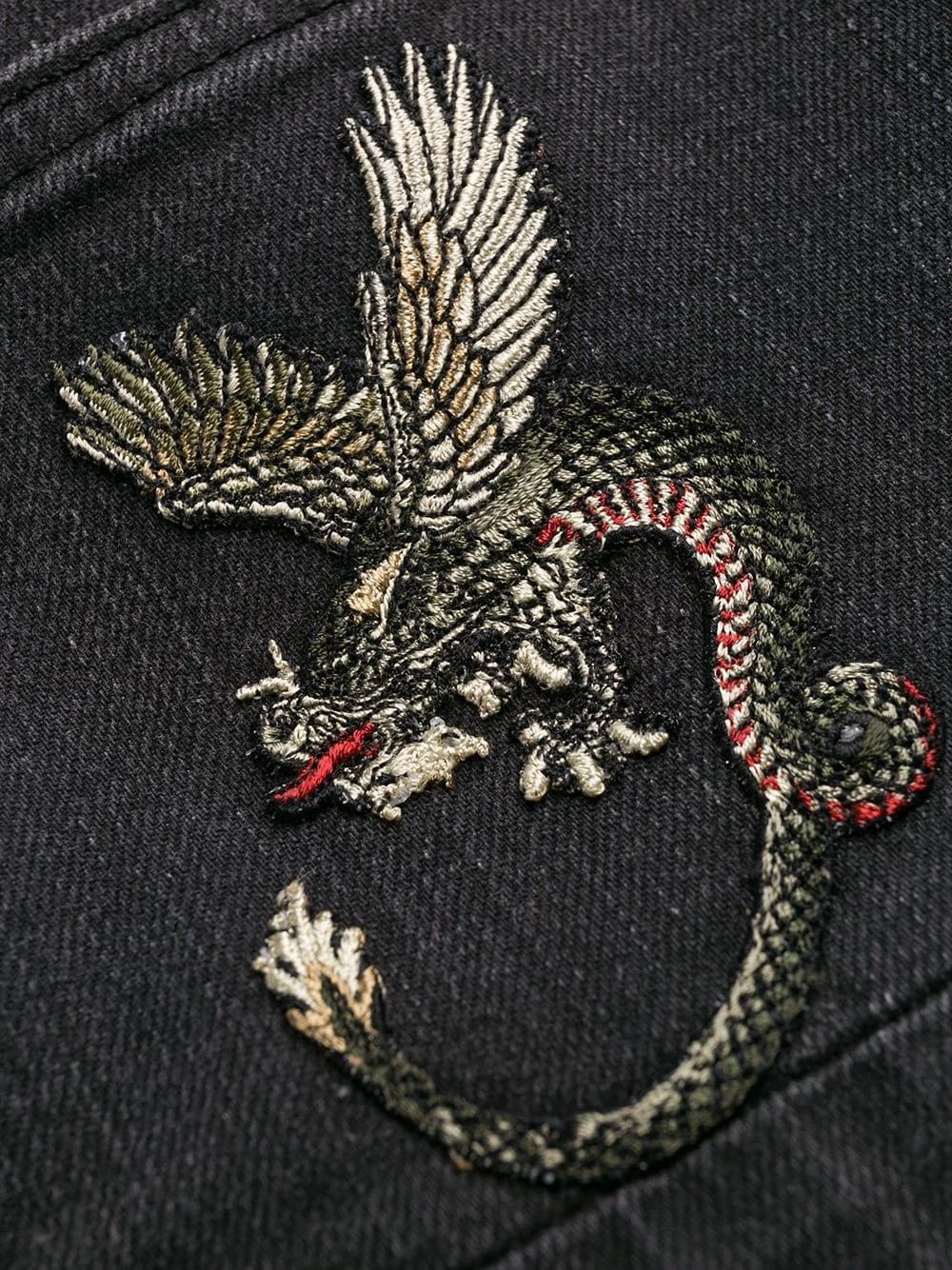 Fire in your belly and a dragon patch on your jeans. Symbols of supernatural power, strength and wisdom, the dragon patch applied to the rear pocket of these washed black cotton slim-fit jeans from Alexander McQueen make for a little added drama. Featuring a button and zip fly, belt loops, a five pocket design, a leather brand patch to the rear and appliqué detailing.