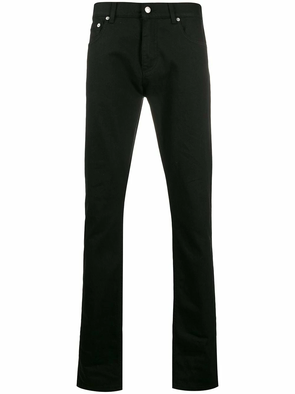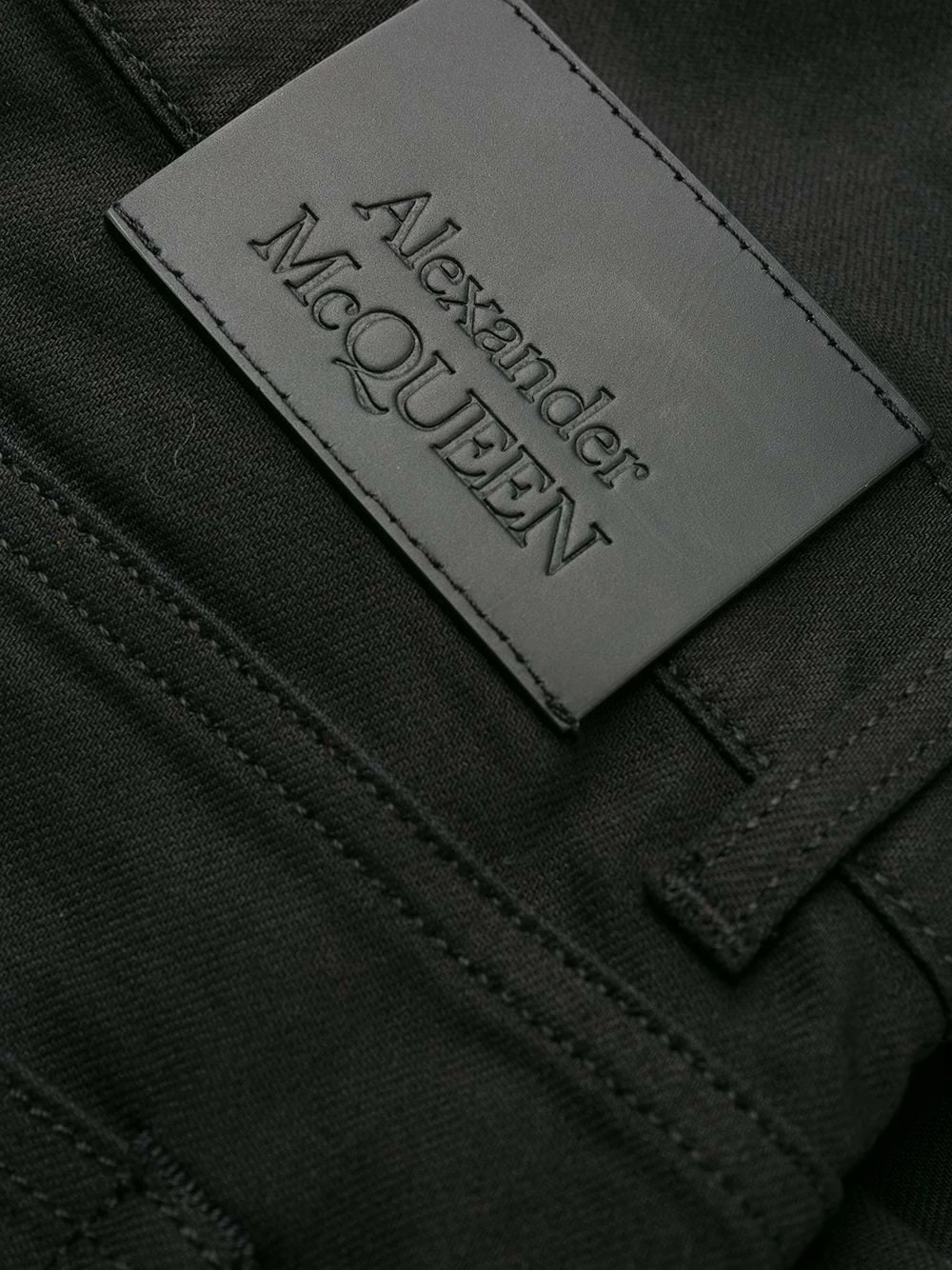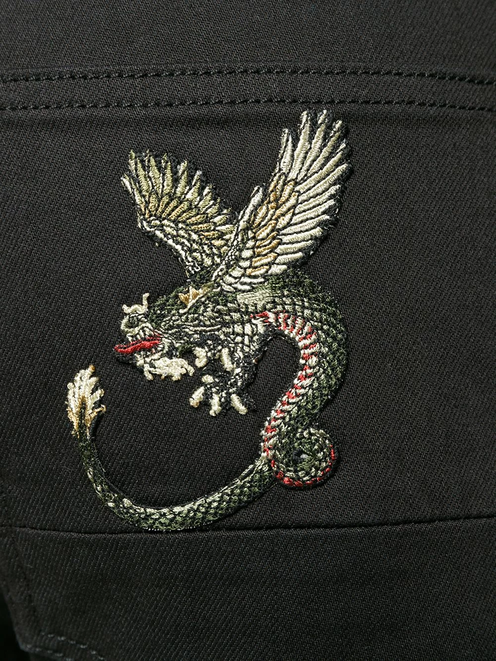 Update your denim courtesy of Alexander McQueen. Crafted in cotton, these black tapered jeans are accented with a dragon patch. The key is in the detail. Featuring belt loops, a five pocket design and a tapered leg.