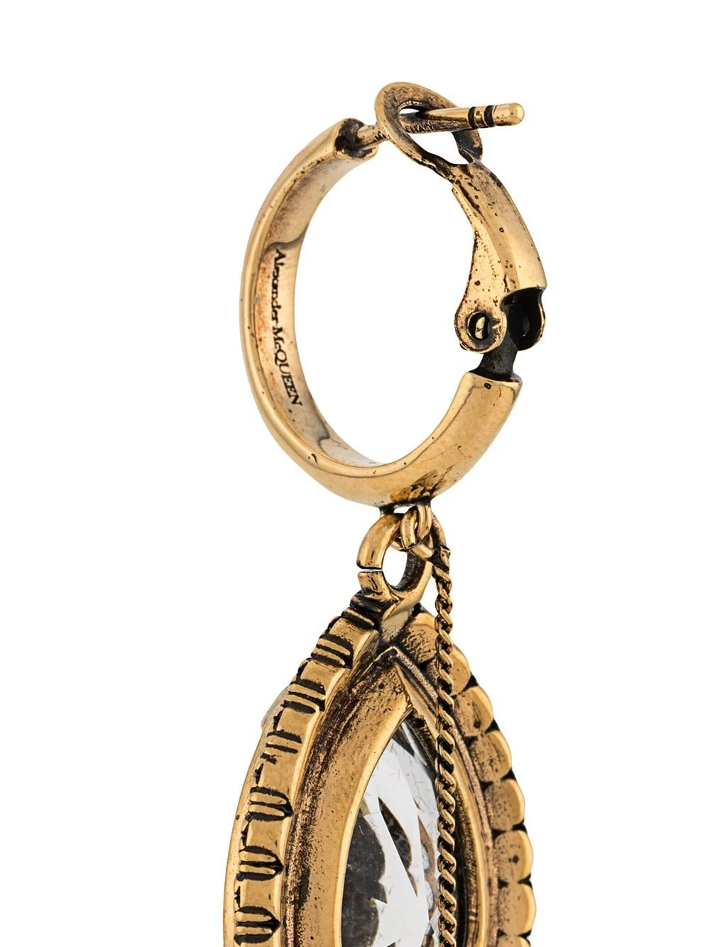 Decorate your whole ear courtesy of Alexander McQueen. In gold-tone metal, this chain cuff earring boasts a crystal drop gemstone and a drop pearl. We love this two-in-one design. Featuring crystal embellishments, a pearl embellishment and a delicate chain. This is a single earring.