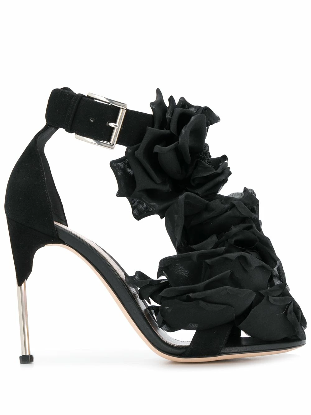 Alexander McQueen’ founder was fascinated with the marriage between gothic and romantic references, and Creative Director Sarah Burton remains committed to incorporating his favorite motifs into each collection. Set on a stiletto heel, these suede sandals are decorated with black roses in bloom and feature a buckle fastening and an open toe.