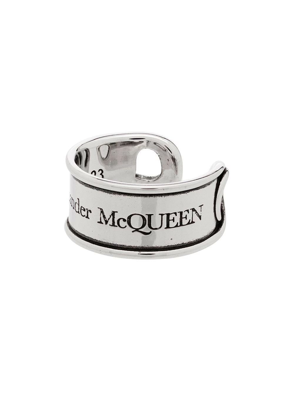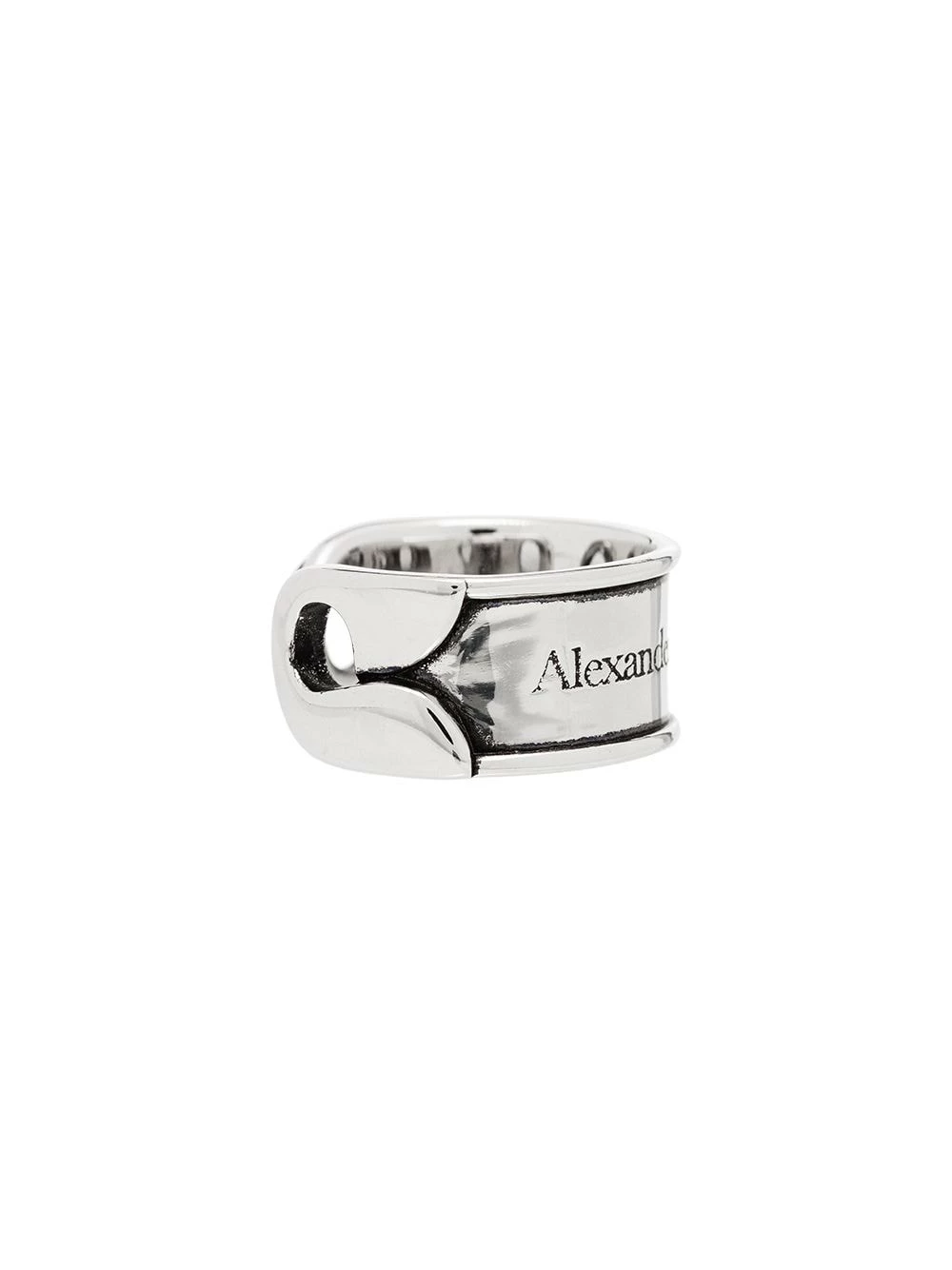 Refresh your treasure trove. This silver-tone brass engraved safety-pin ring from Alexander McQueen is perfect for everyday wear. Note the engraved logo lettering.