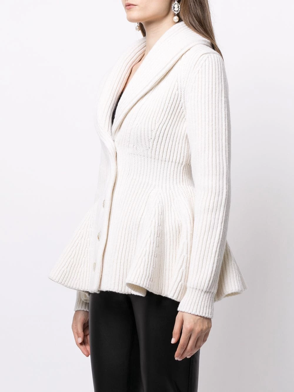 Knitwear but make it Alexander McQueen. Featuring a peplum waist, and flared sleeves this Exploded rib-knit cardigan will add a Victorian edge to your outfit. Historic.
