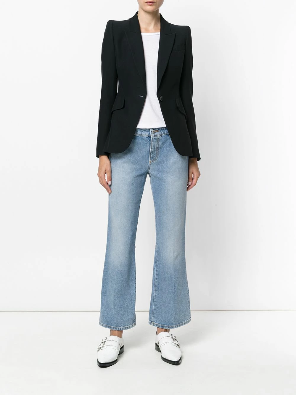 Stay cool and casual yet also fashionable with these cotton flared jeans from Alexander McQueen. These jeans in faded blue, feature a front button and zip fly, belt loops, a five pocket design and a cropped length.