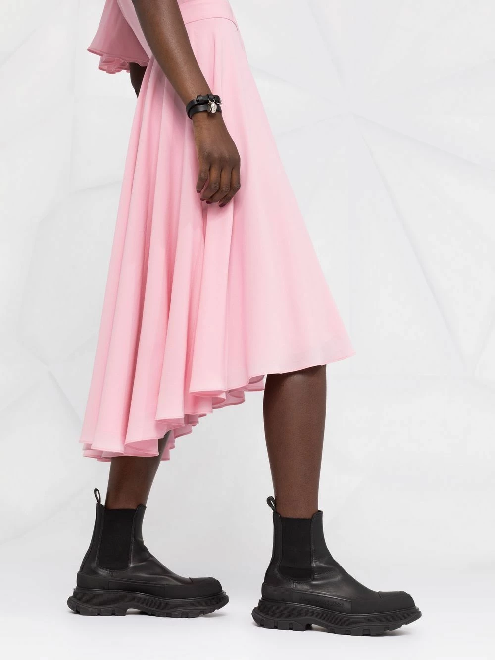 You can’t stop staring at this light pink silk dress from Alexander McQueen either, huh? With its flared mid-length skirt and matching flared short sleeves, it’s the perfect outfit for a soirée. Good thing that party is coming up, right?