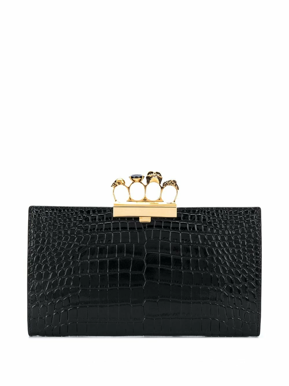 Carry your essentials in style with this black Four Ring clutch bag from Alexander McQueen. Complete with an iconic skull embellishment and an embossed finish, this one’s a staple party accessory. In true McQueen style.