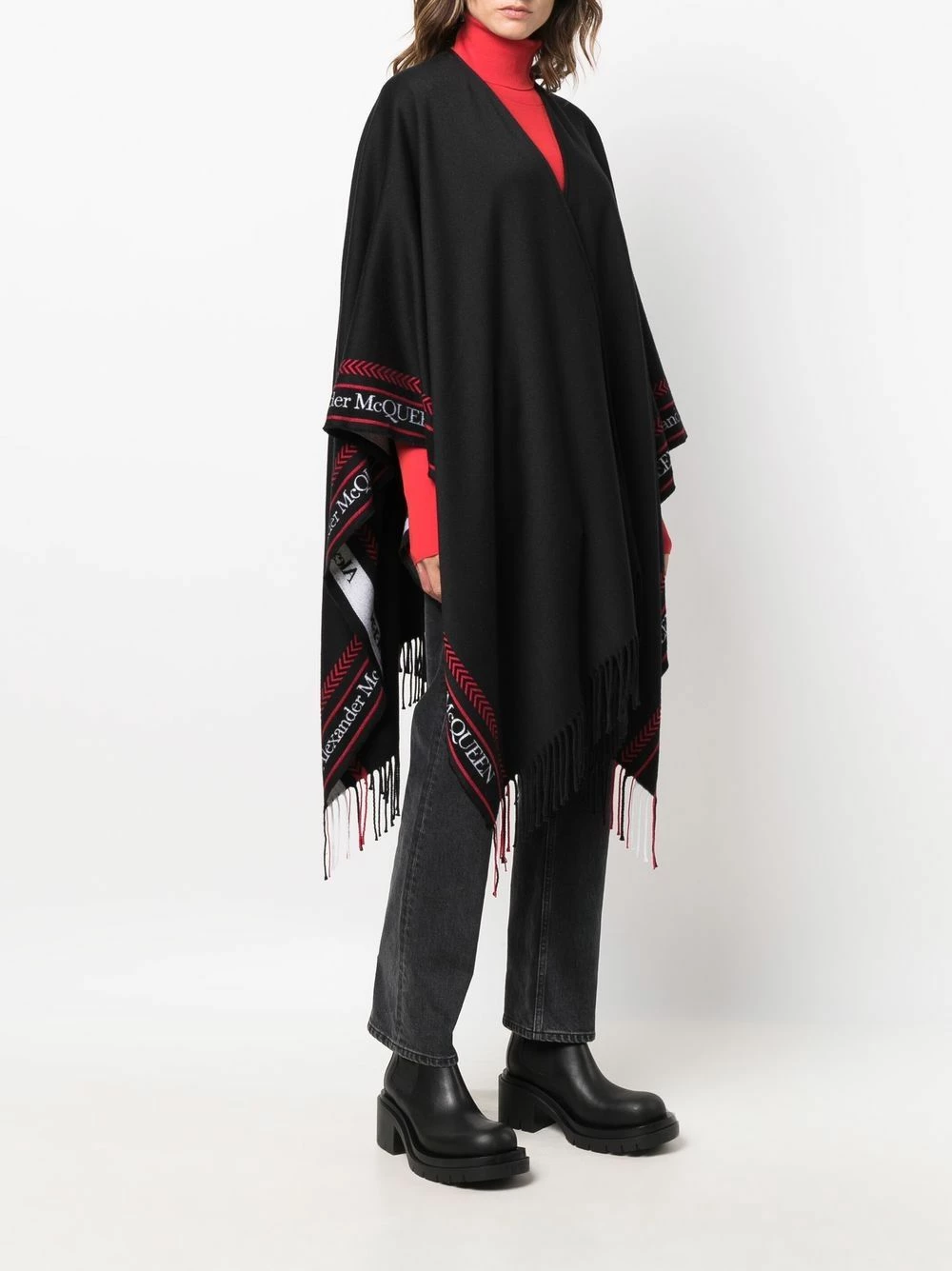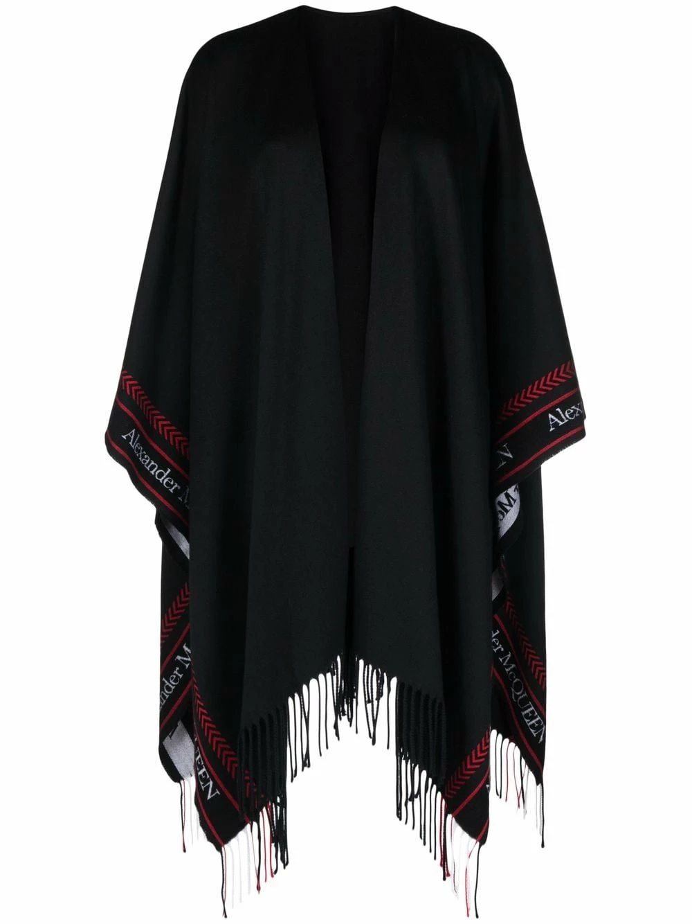 Black wool-blend fringed knit logo-edge poncho from Alexander McQueen featuring knitted construction, logo trim, fringe detailing, open front and short sleeves.