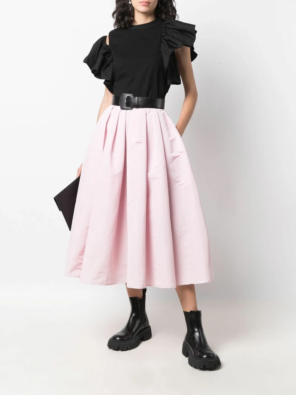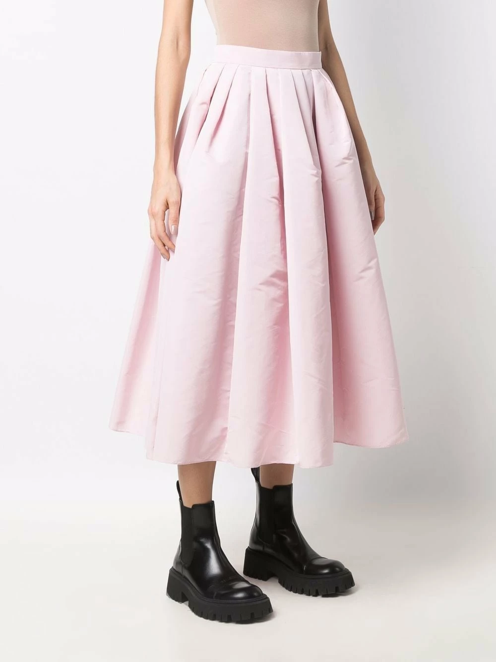 Alexander McQueen shows their affinity for impeccable construction and statement silhouettes with this full skirt. The soft pink-hued piece is fully pleated with a flared design, and features two pockets on the sides, adding to its allure.