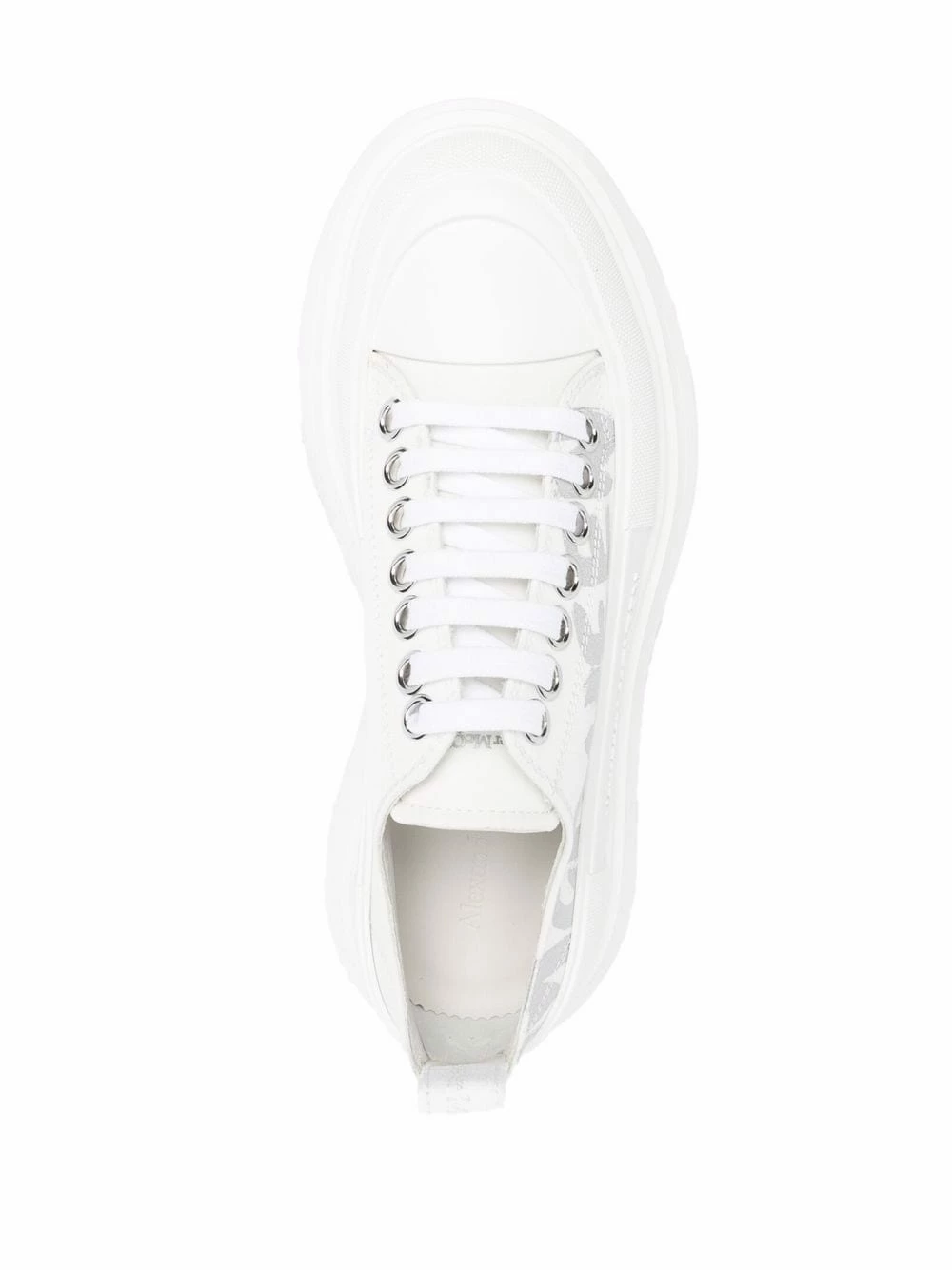 Alexander McQueen makes a new offering of the brand’s signature Tread Slick sneakers. Set atop the instantly recognisable chunky rubber outsole, this low top pair features the label’s Graffiti logo print to one side in a contrasting silver hue.