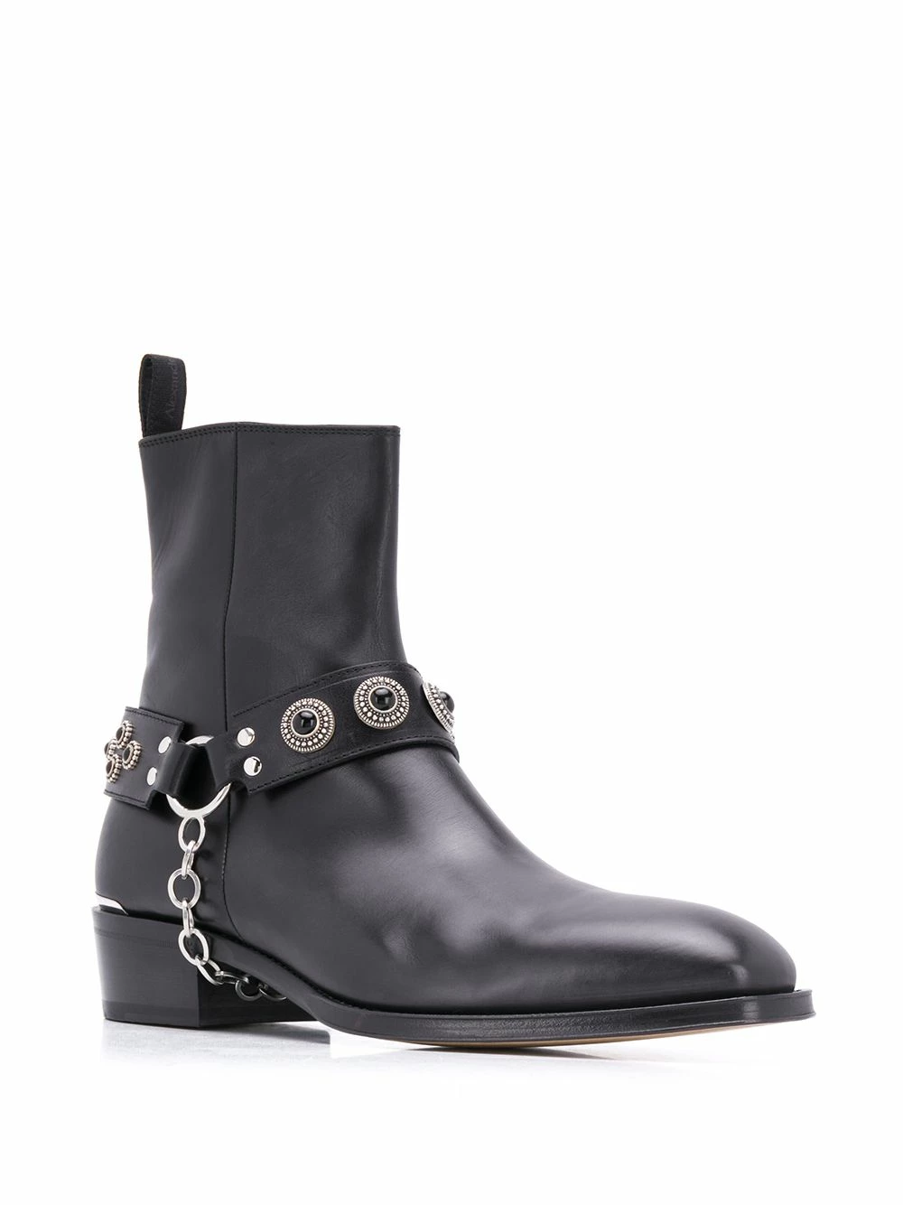 Restlessly inserting light punk rock references to traditional pieces, Alexander McQueen is the place of birth of attitude and statements, as seen with these black leather Harness Cuban heel boots. Featuring a pull tab at the rear, an almond toe, a detachable jewelled harness and a stacked Cuban heel. Please note that Alexander McQueen’s items no longer come with a dust bag.