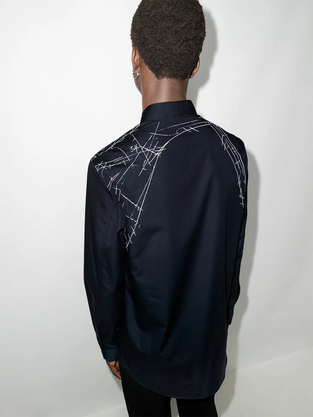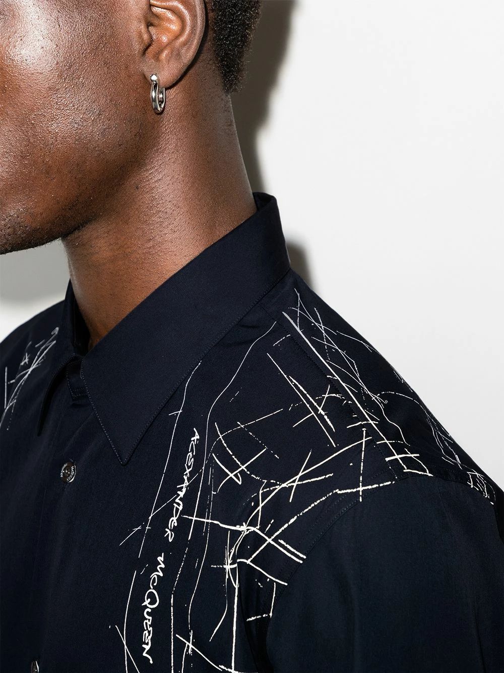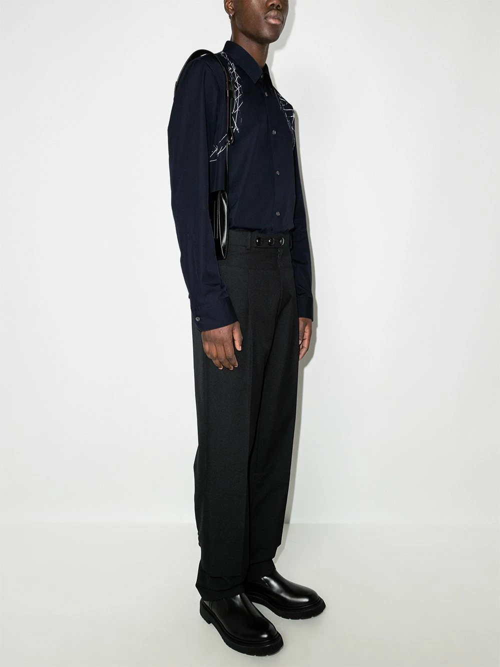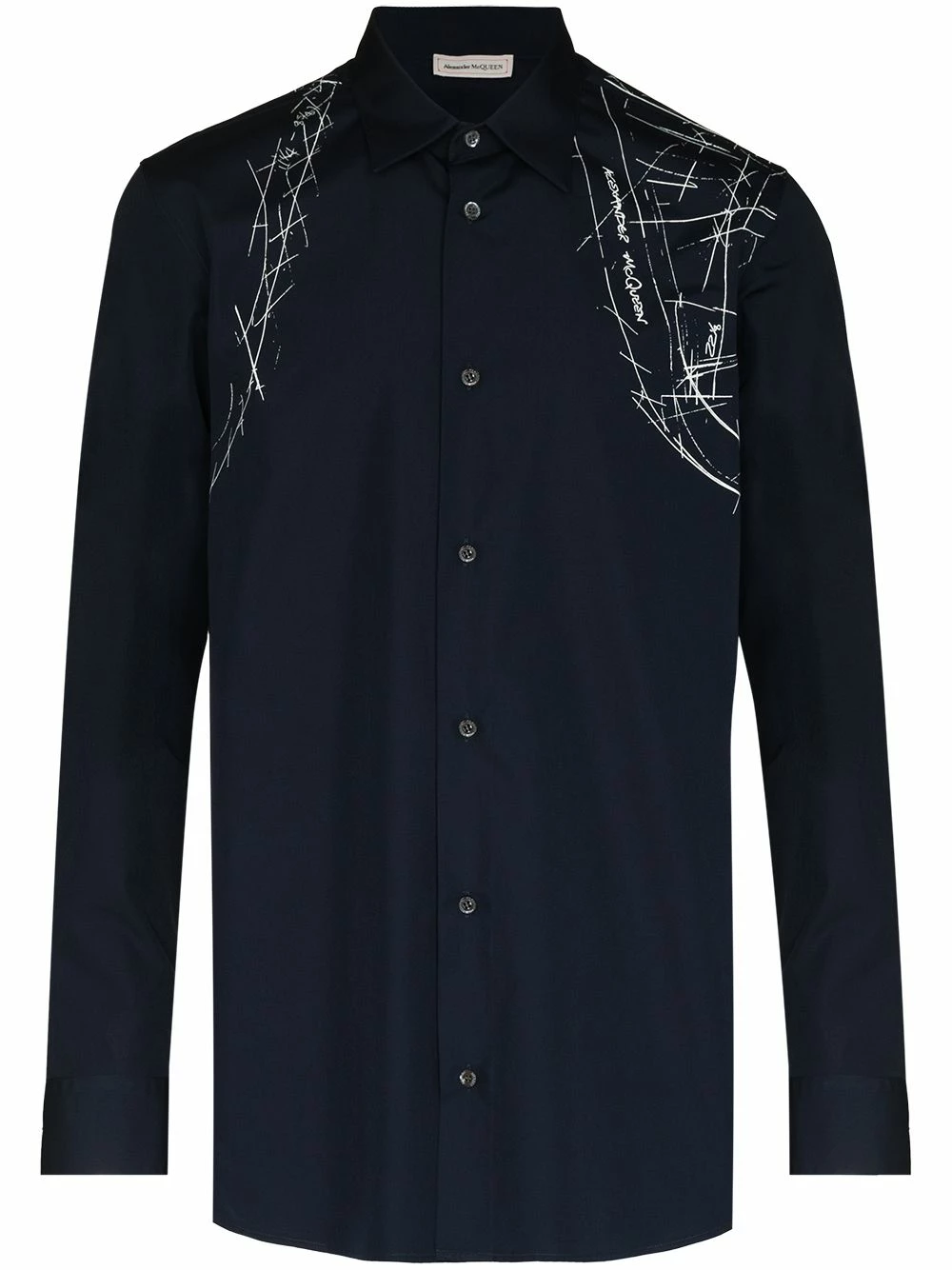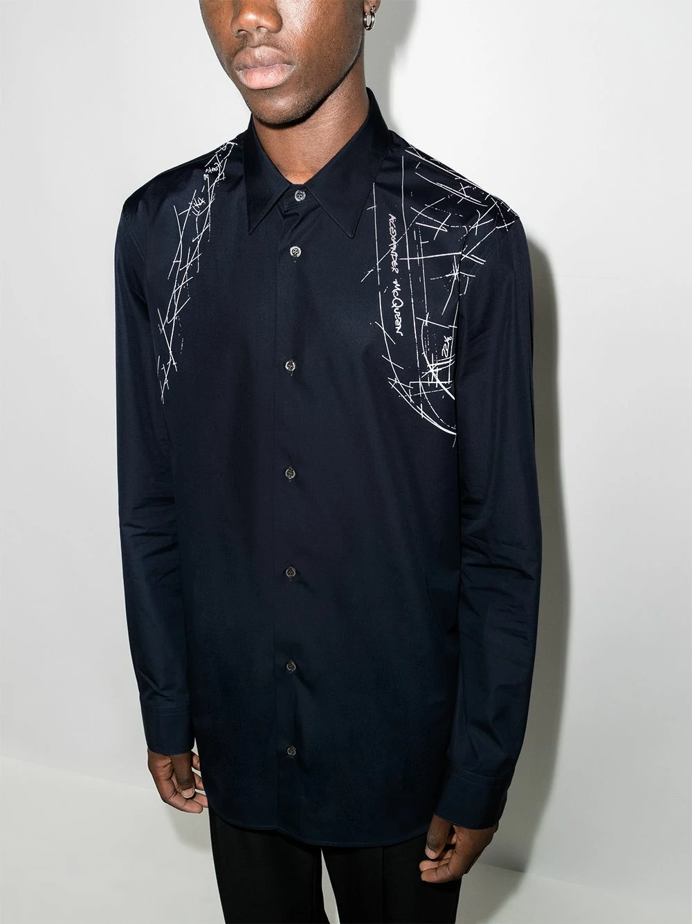 Alexander McQueen adds a signature twist to this classic dark-blue shirt. Made from cotton, it is adorned with a logo-print harness detail, aligned with the brand’s dark glamour aesthetic.