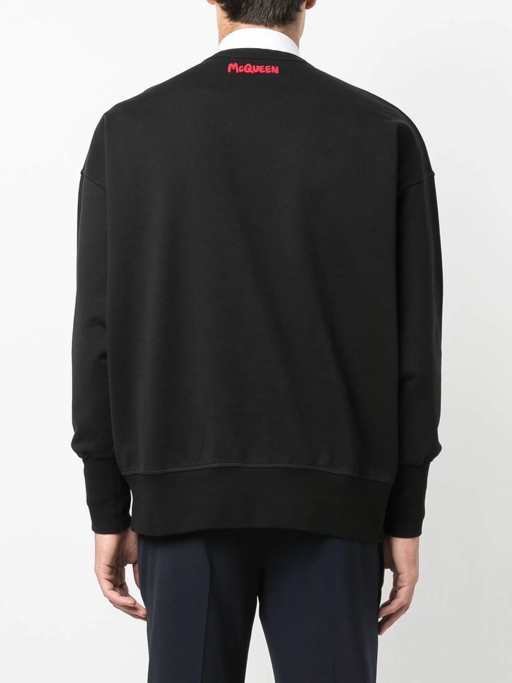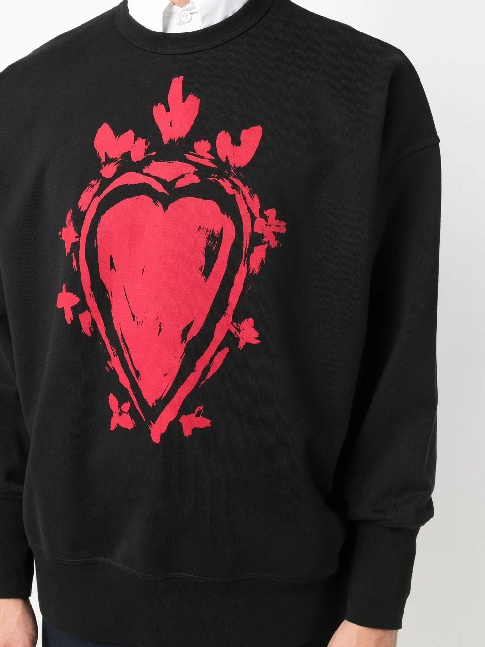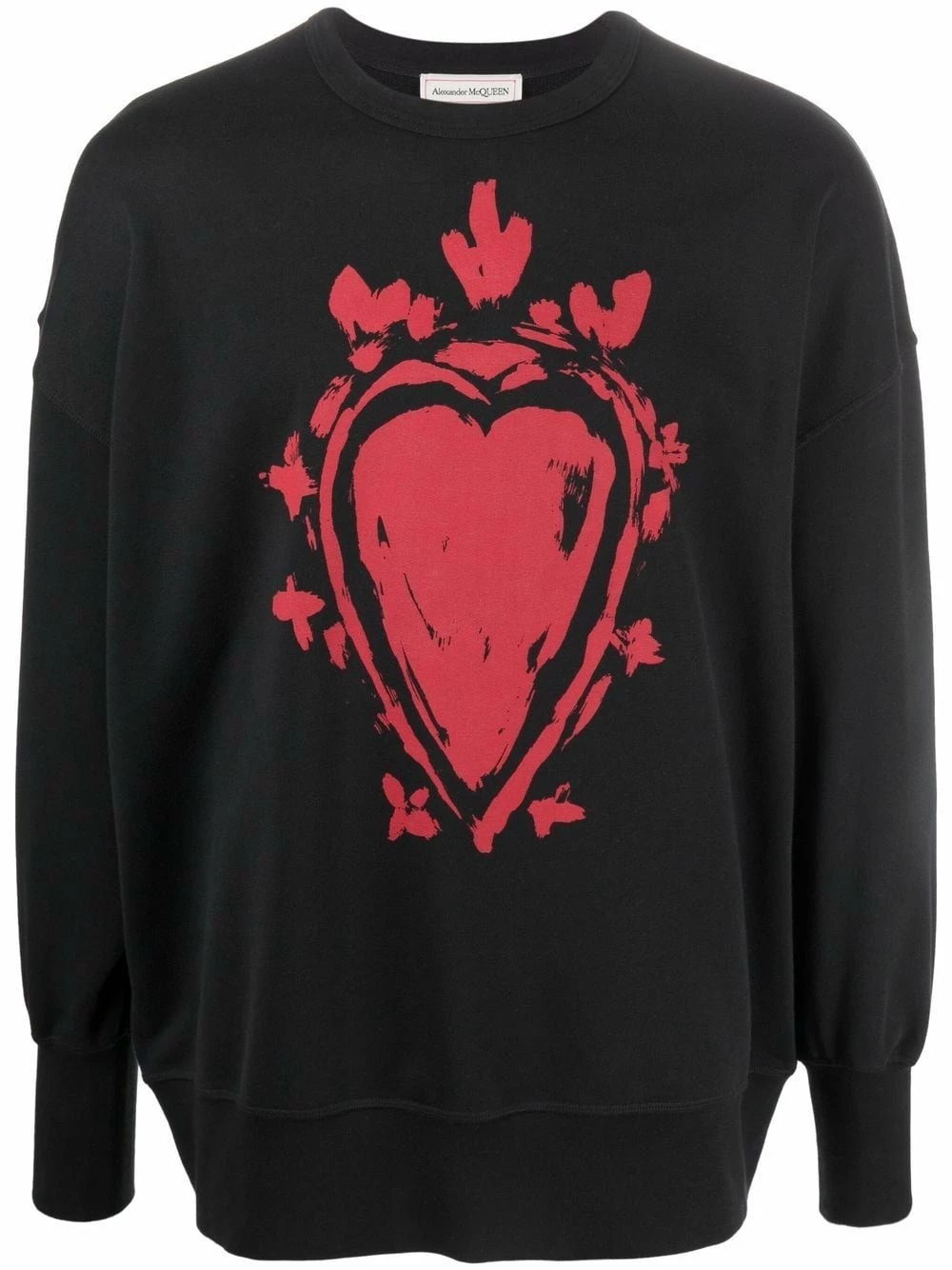 This AW21 under Sarah Burton’s creative direction, Alexander McQueen’s latest collection is decorated with hearts, doves and sun motifs. The first of the insignias can be seen boldly printed on this black sweatshirt.