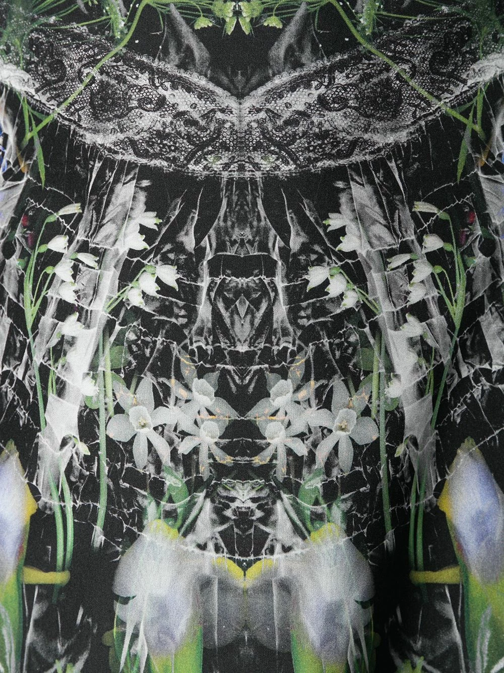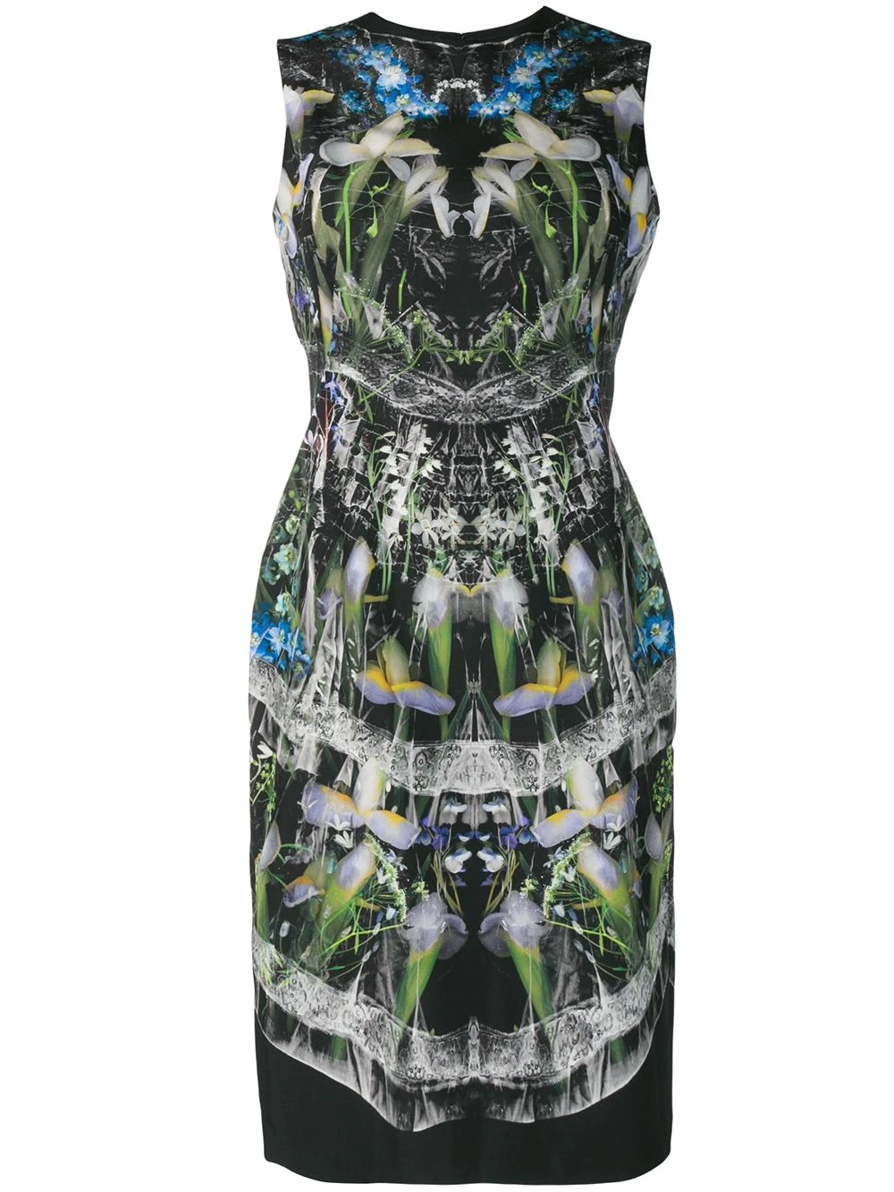 Alexander McQueen replaces gothic, dark romanticism for colourful feminine designs in the new SS19 collection, as showcased by this hologram print dress. Featuring a round neck, a sleeveless design, a fitted silhouette, a rear zip fastening and a rear central vent.