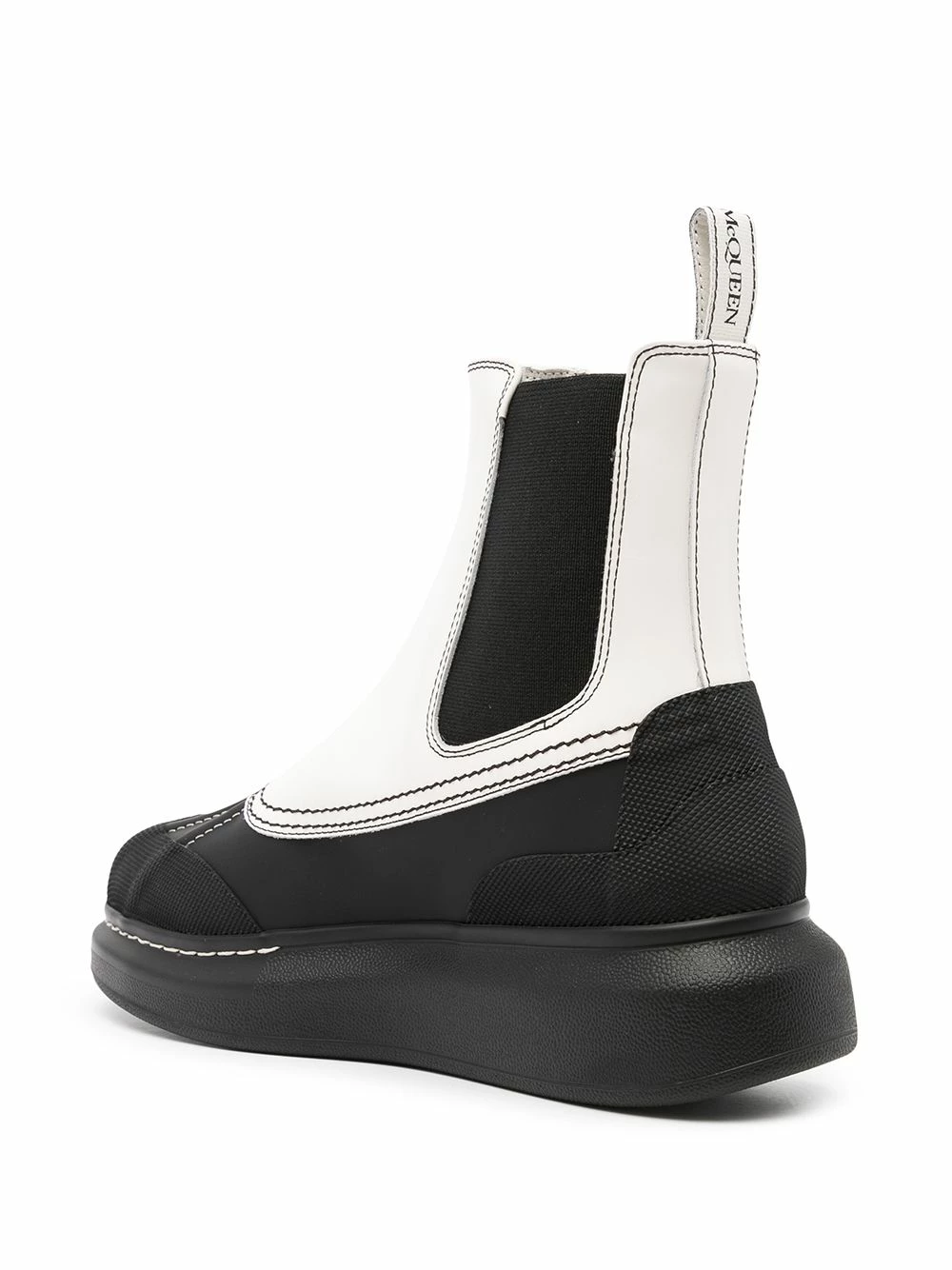 Part of Alexander McQueen’s AW21 edit, these Duck Hybrid blend a utilitarian style with the classic Chelsea silhouette. In a two-tone design, this pair features the typical elasticated side panels and is set atop a chunky rubber sole.