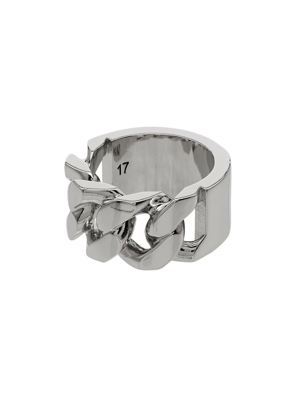 Looking for a new signature piece? Look no further than this engraved logo ring from Alexander McQueen. You’ll never want to take it off. Featuring an engraved logo, a chain link style, a silver-tone finish, a structured design, a chunky chain detail and an engraved logo.