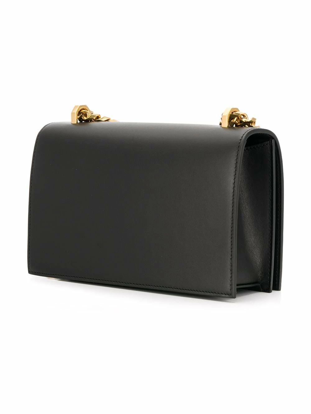 Alexander McQueen is renowned for being the champion of eye-popping theatrics, toughening up everyday accessories with gothic romanticism. This black leather Jewelled shoulder bag from Alexander McQueen features a chain and leather strap, a foldover top with magnetic closure, an internal zipped pocket, an internal logo stamp and a gold-toned four ring adornment encrusted with Swarovski crystals to the front.