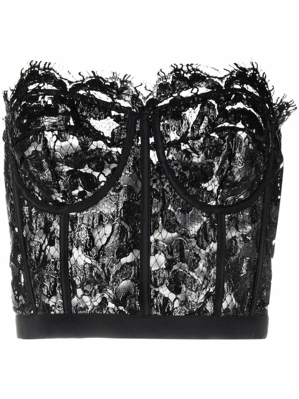 Known for a design style that balances romantic with gothic, it is reflected in this Alexander McQueen strapless top featuring lace panelling and a boned bodice. Refined in its tonal colourway, it also highlights the technical construction of the garment.