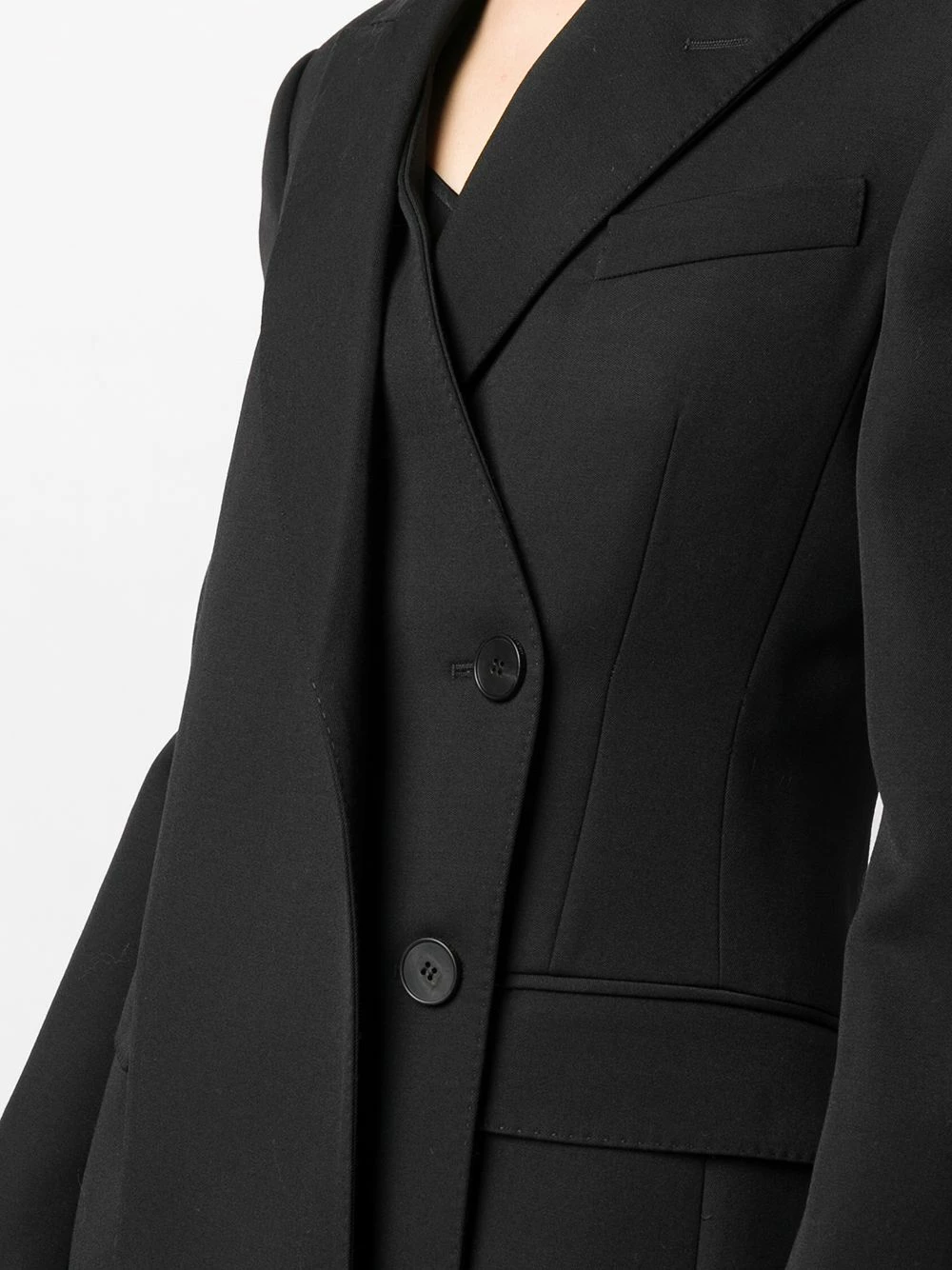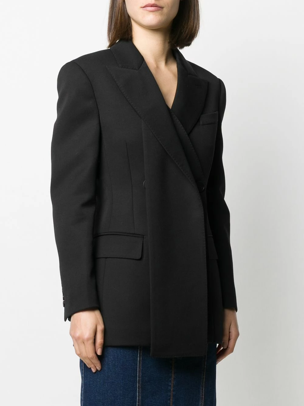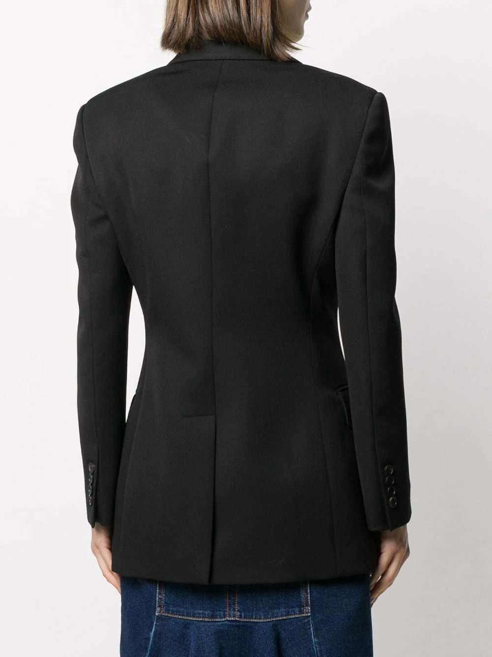 Button up in style. With layered details, this black virgin wool double-breasted blazer from Alexander McQueen offers an alternative to classic styles. It’s the smart choice.