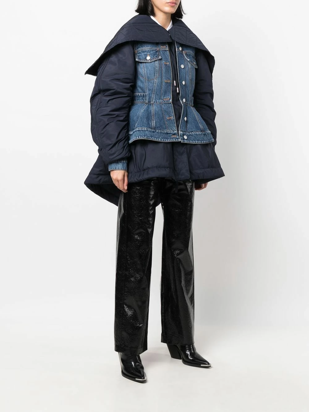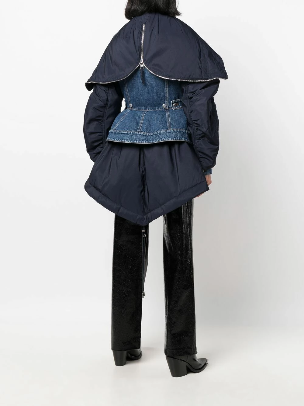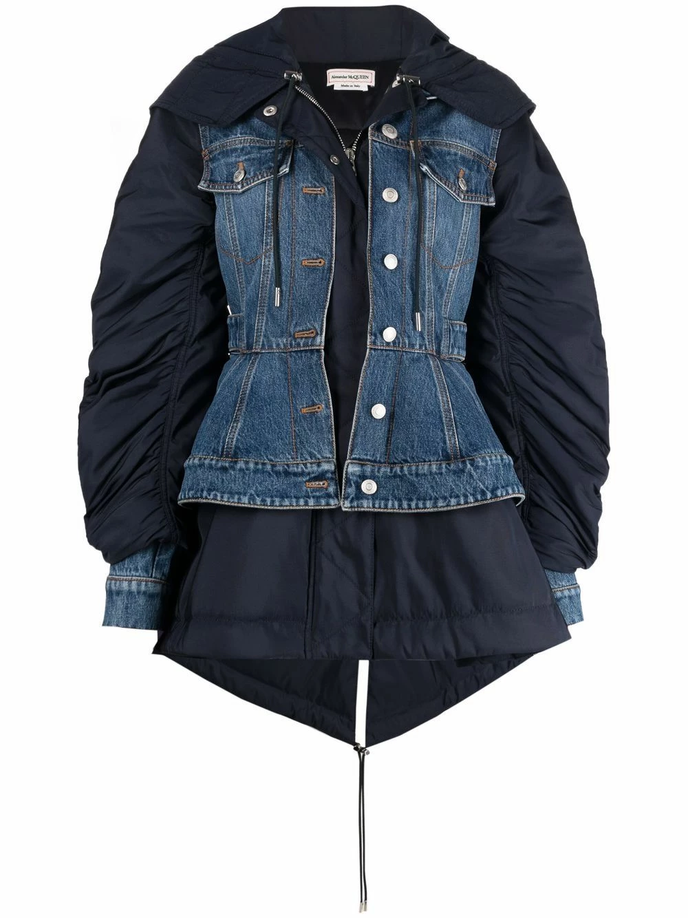 A signature piece from Alexander McQueen’s AW21 presentation, this multi-faceted peplum jacket is detailed with bomber and denim fabrications. Punctuated by bishops sleeves and an oversized foldover collar, the striking design shows off McQueen’s tailoring mastery.