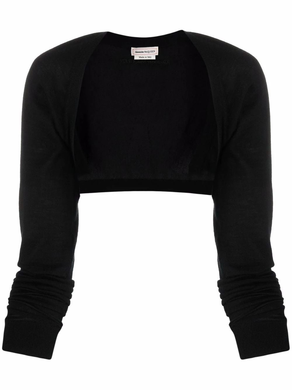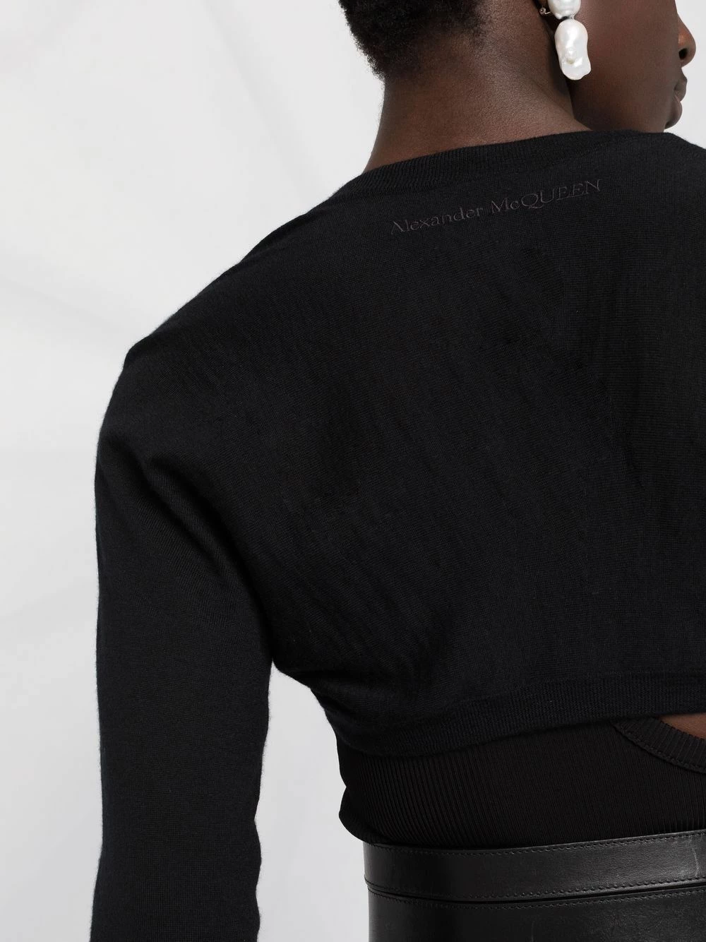 Crafted from cashmere in a fine knit, this black shrug from Alexander McQueen is a versatile layering option. Note the embroidered logo to the rear for a signature touch..