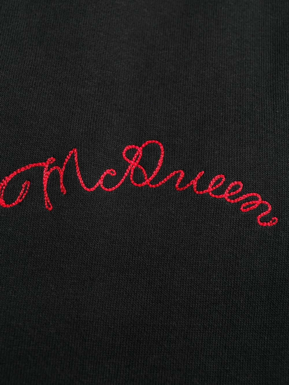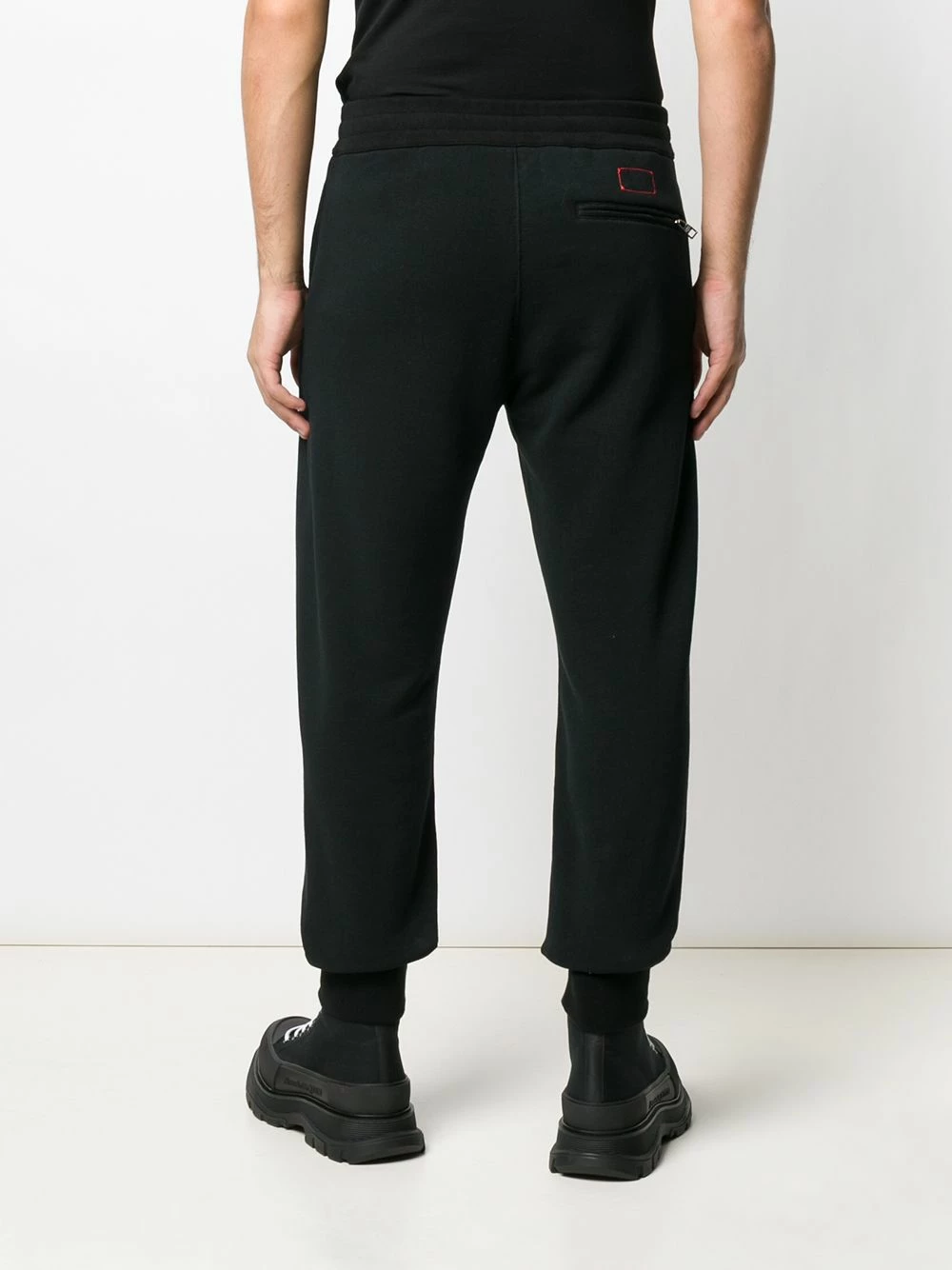 Gym classes but make it fashionable. Made from cotton, these black cotton logo embroidered track pants from Alexander McQueen are not your regular gym wear. Training in McQueen? How fancy of you. Now it’s time to sweat. Featuring an elasticated waistband, a back zip pocket, side slit pockets, a regular length, a tapered leg, elasticated ankle cuffs and a contrasting red logo embroidered to the front.
