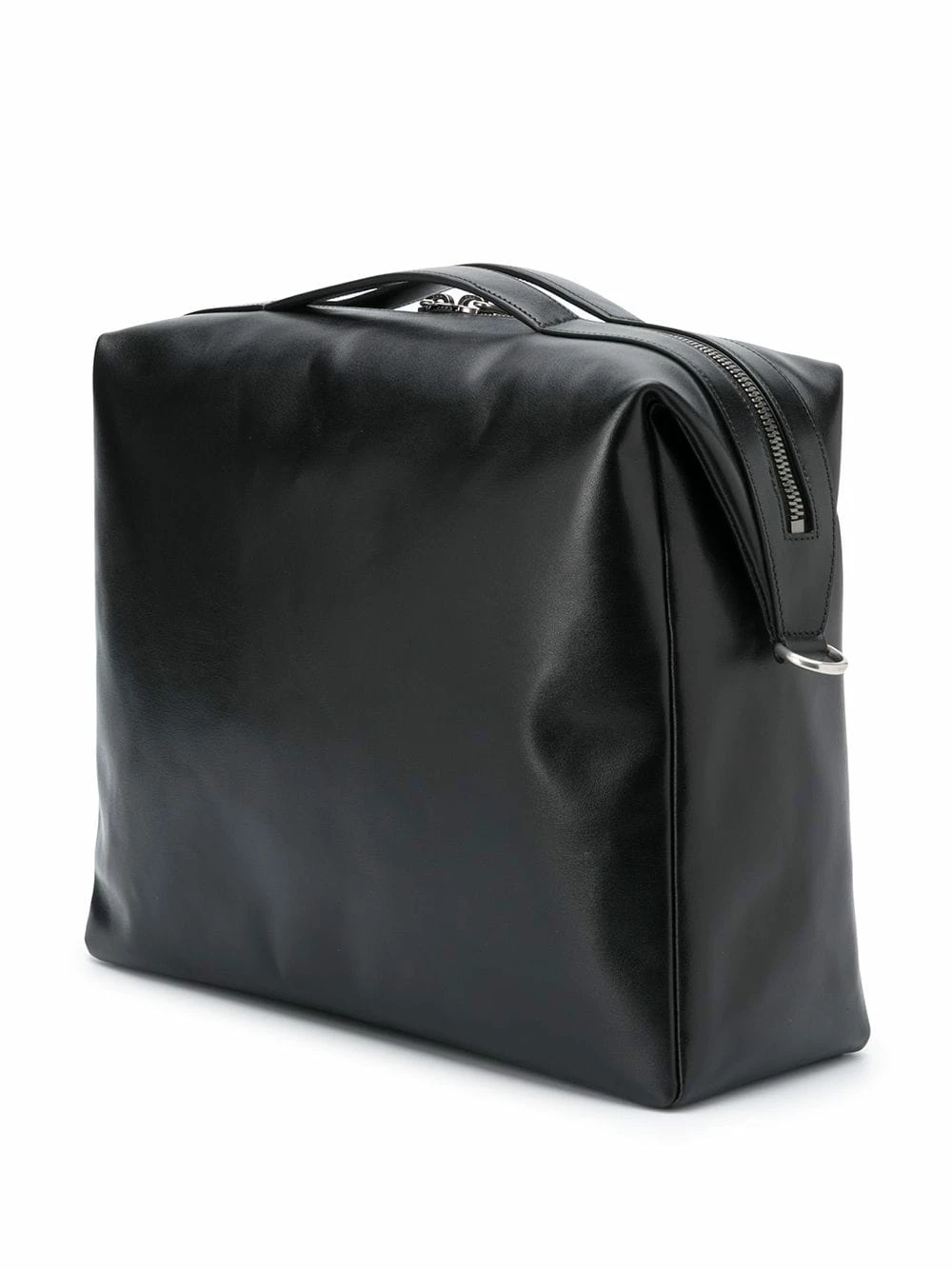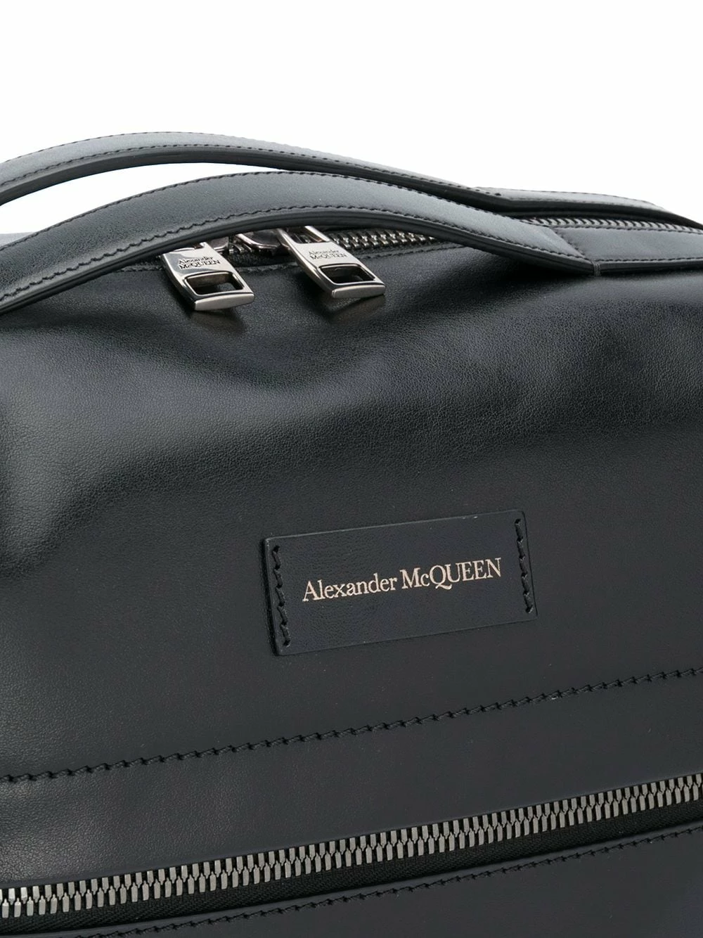 Black leather logo-patch tote bag from Alexander McQueen featuring logo patch to the front, top zip fastening, two rounded top handles, adjustable detachable shoulder strap, logo shoulder strap, front zip-fastening compartment and internal card slot.