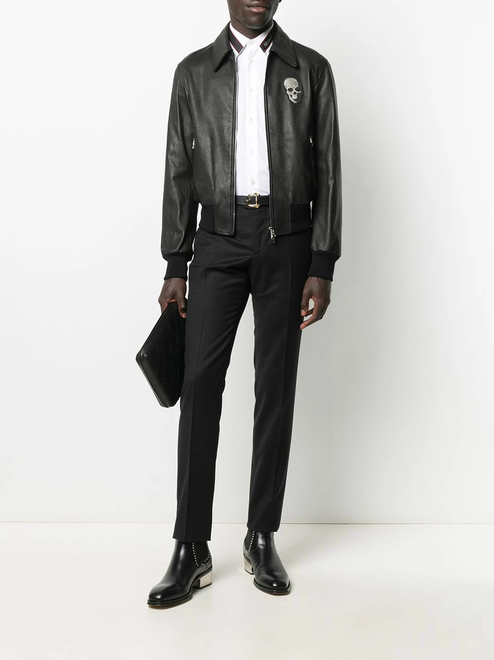 Add some gothic energy to your wardrobe with Alexander McQueen. With a skull patch at the chest and a leather construction, this jacket is here to celebrate Halloween every night of the year. Spooky.