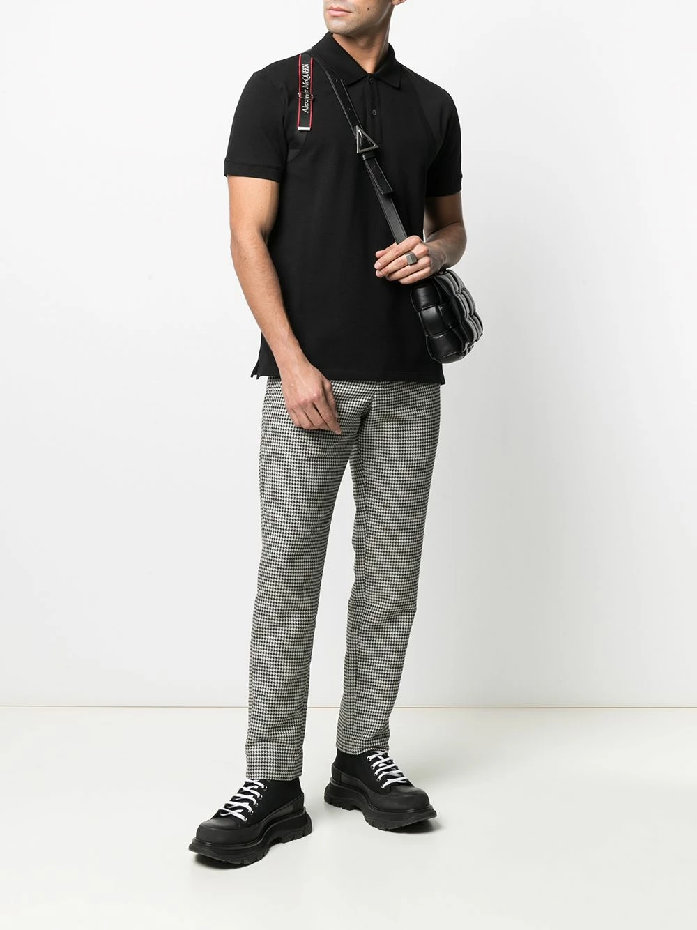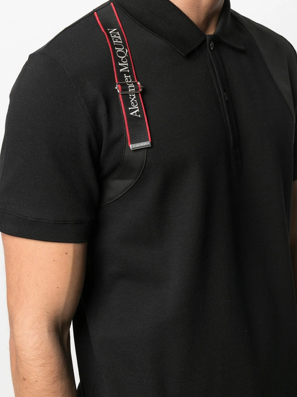 A wardrobe staple with a twist. Stand out from the regular polo shirt crowd thanks to the logo tape and safety pin at the sleeve of this Alexander McQueen number. Blending in is not an option.