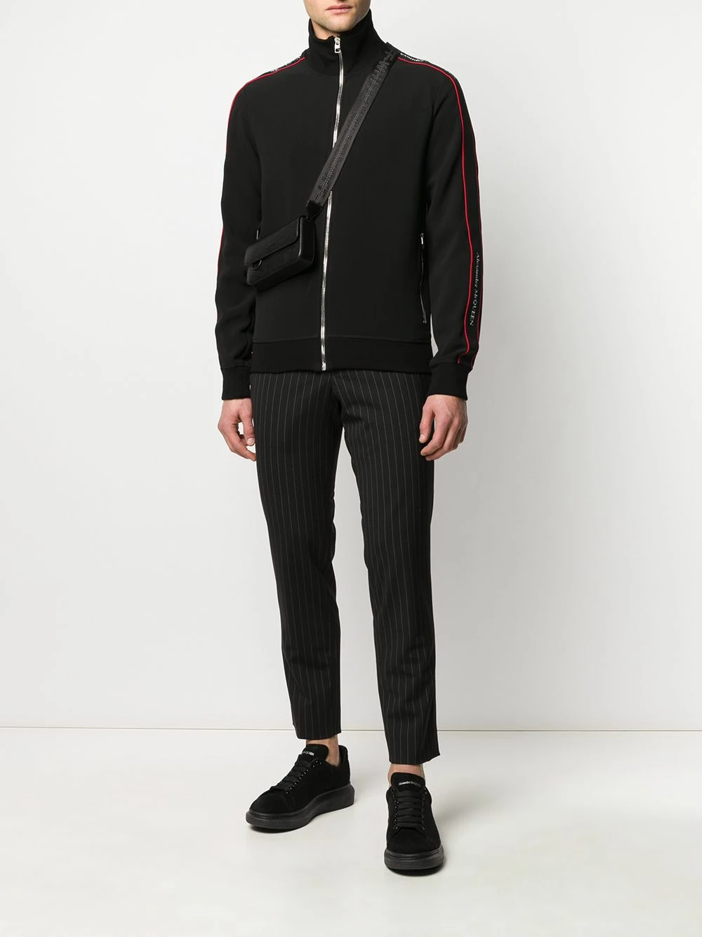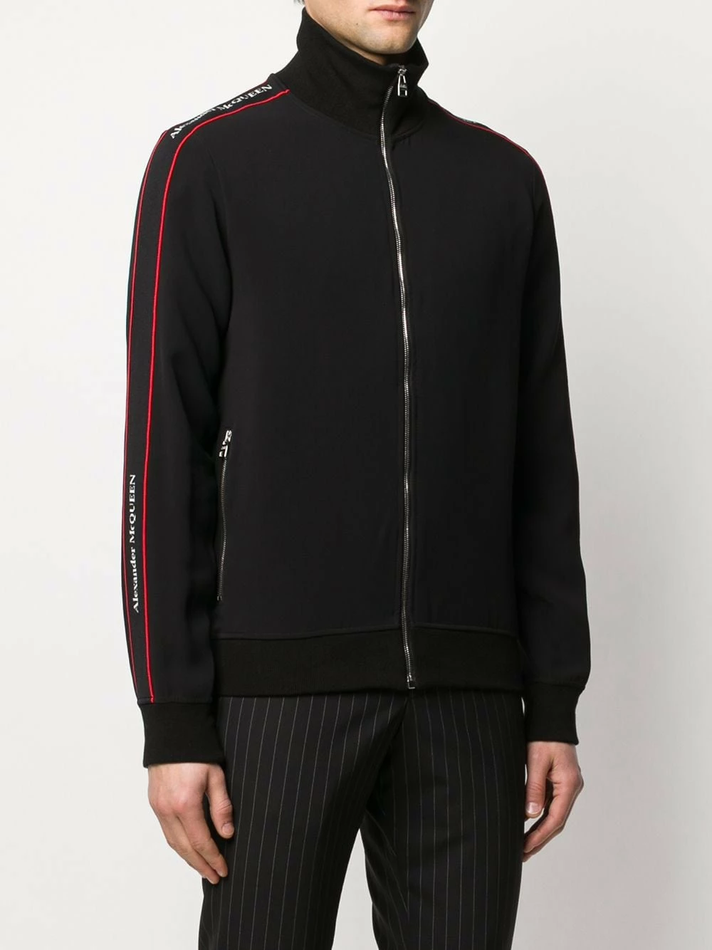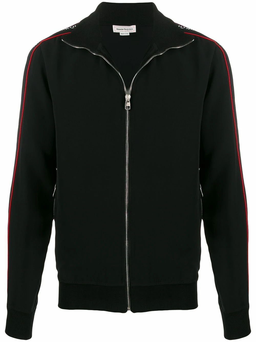 Keep it casual all you want – but do it in style. Crafted from cotton, this black track jacket from Alexander McQueen is detailed with white and red logo tape to the sleeves for an extra cool touch. The go-to for a relaxed day off. Featuring a funnel neck, a front zip fastening, long sleeves, side zipped pockets and a ribbed hem and cuffs.