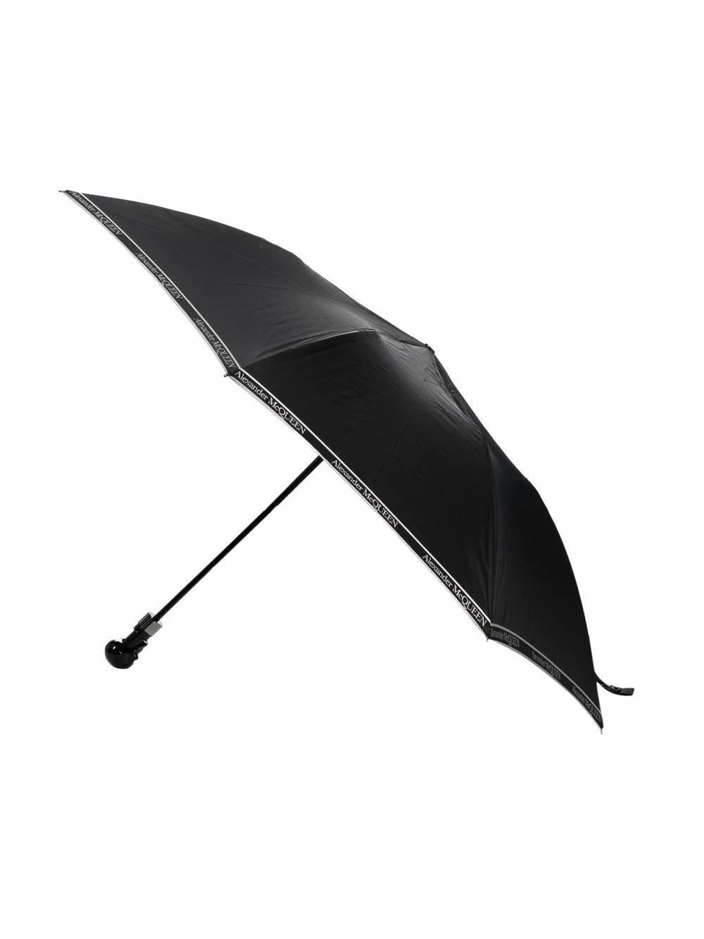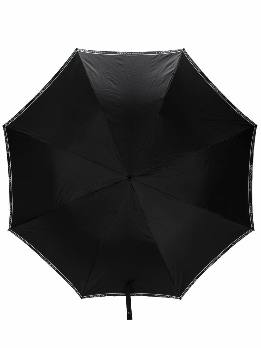 Black logo trim umbrella from Alexander McQueen featuring logo trim, skull handle and retractable design.