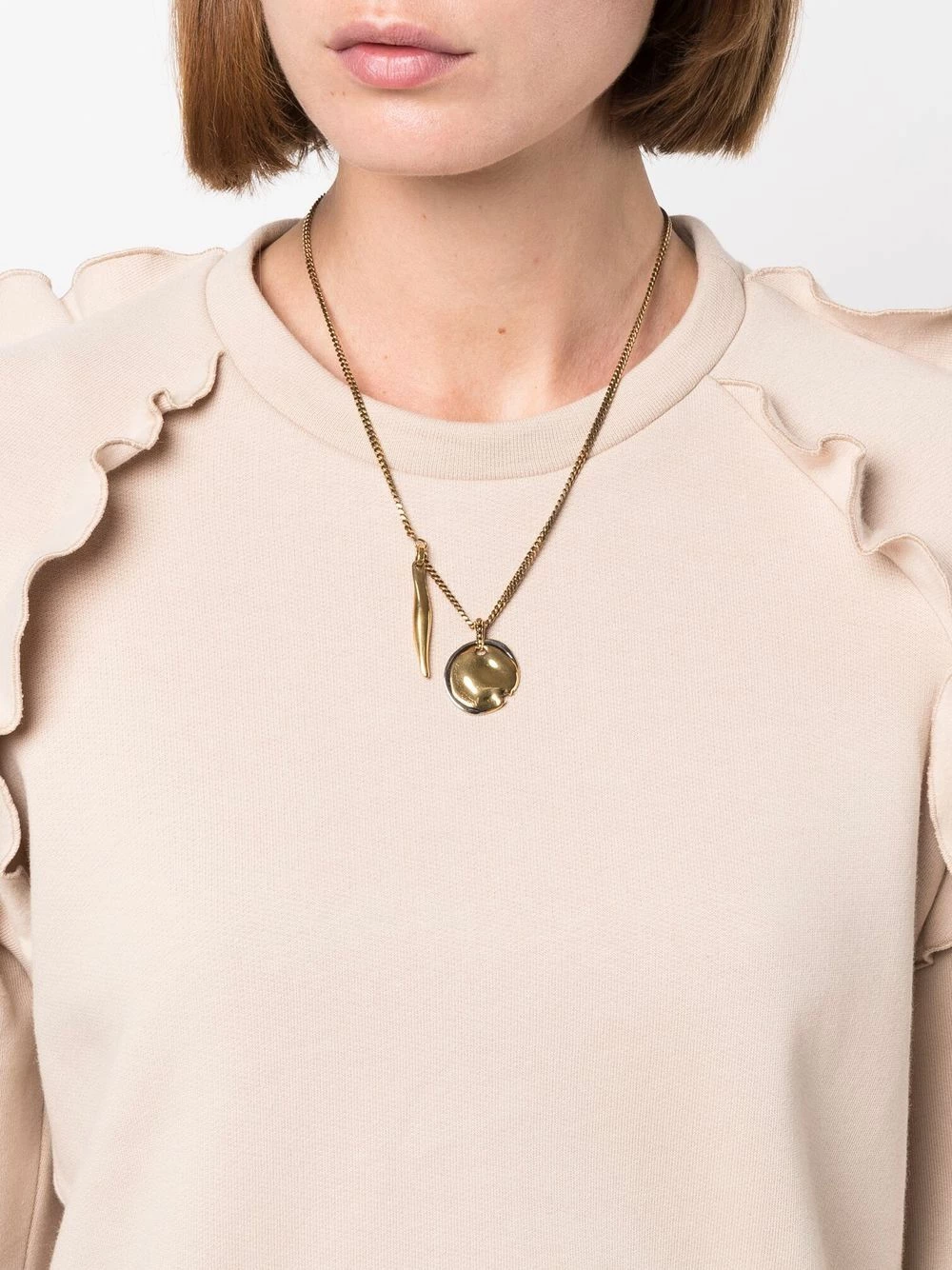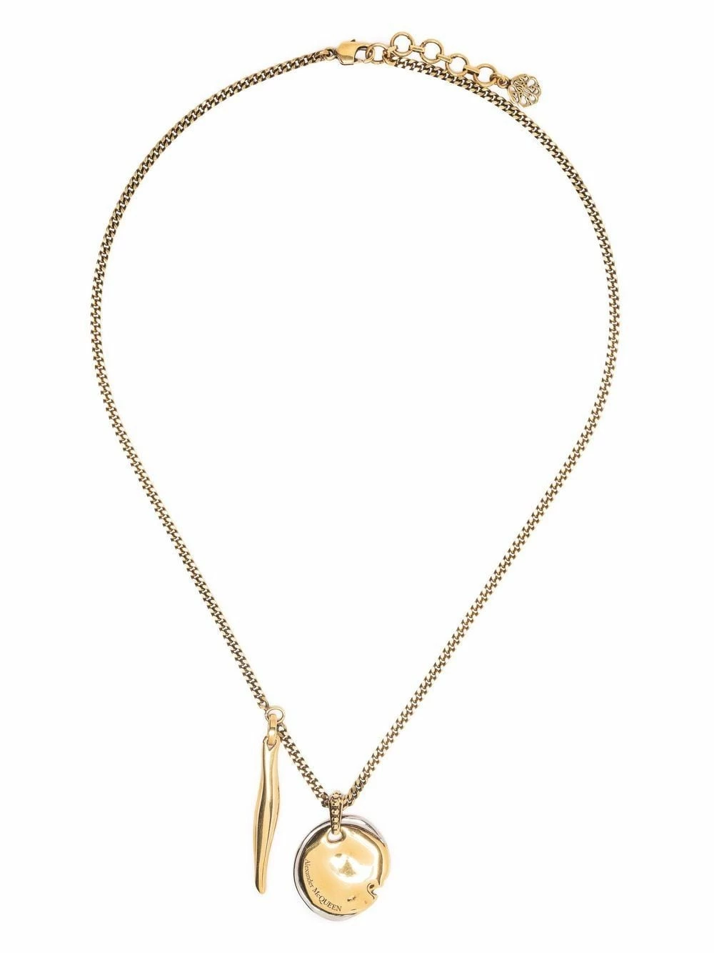 Alexander McQueen’s rule-breaking approach can be seen throughout the brand’s collections. It is highlighted in the asymmetric double-pendant detail on this polished gold-tone necklace.